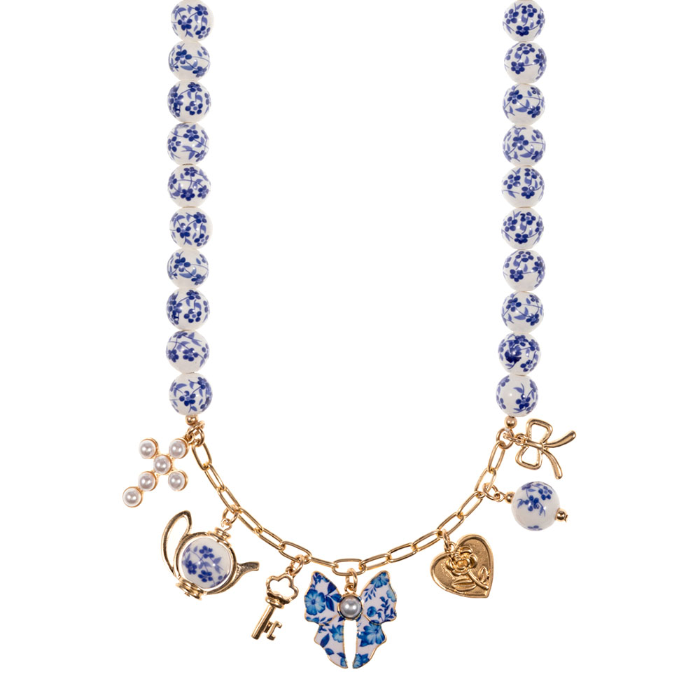 Details • Necklace Size : 17" + 3.5" L • Decor Size : 1.2" L • Whimsical charm necklace featuring floral-inspired beads and playful hanging accents for a romantic, boutique-ready look. Designed to elevate everyday outfits or special occasions with feminine detail and eye-catching movement. A versatile statement piece ideal for gift shops, fashion collections, and trend-driven customers seeking unique accessories. • Lead and Nickel Compliant