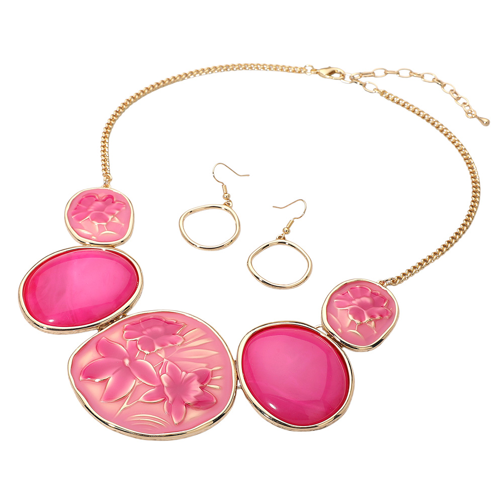 • Elegant statement necklace and earrings set featuring embossed floral designs on smooth, polished oval accents. The sculpted flowers and glossy finish add a touch of sophistication, perfect for enhancing formal outfits or making a bold fashion statement.