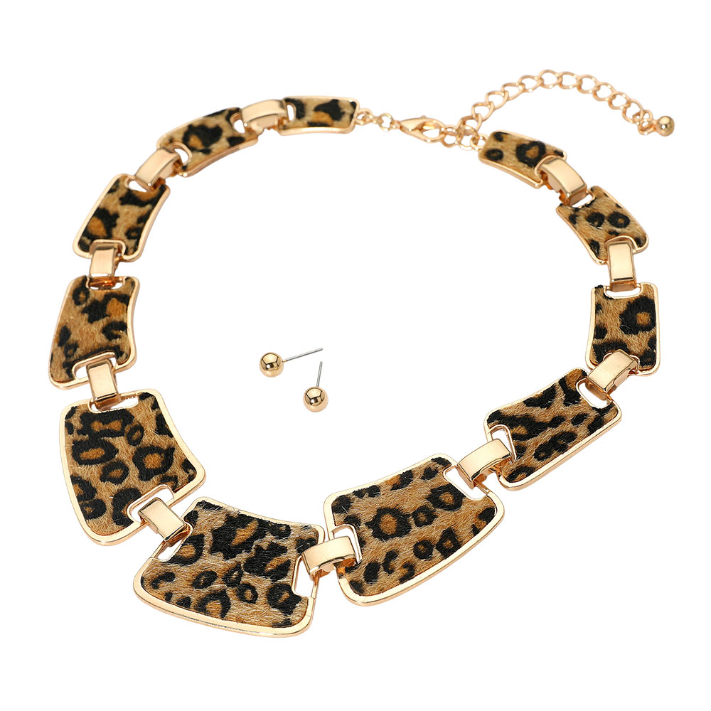 Details • Necklace Size : 17" + 3" L • Decor Size : 1.25" L • Earrings Size : 0.25" L • Make a bold impression with this statement necklace featuring wide linked panels in a striking leopard pattern. Designed to elevate any outfit, it comes with matching stud earrings for a complete look. Perfect for parties, evening events, or adding a dramatic edge to everyday style. • Lead and Nickel Compliant