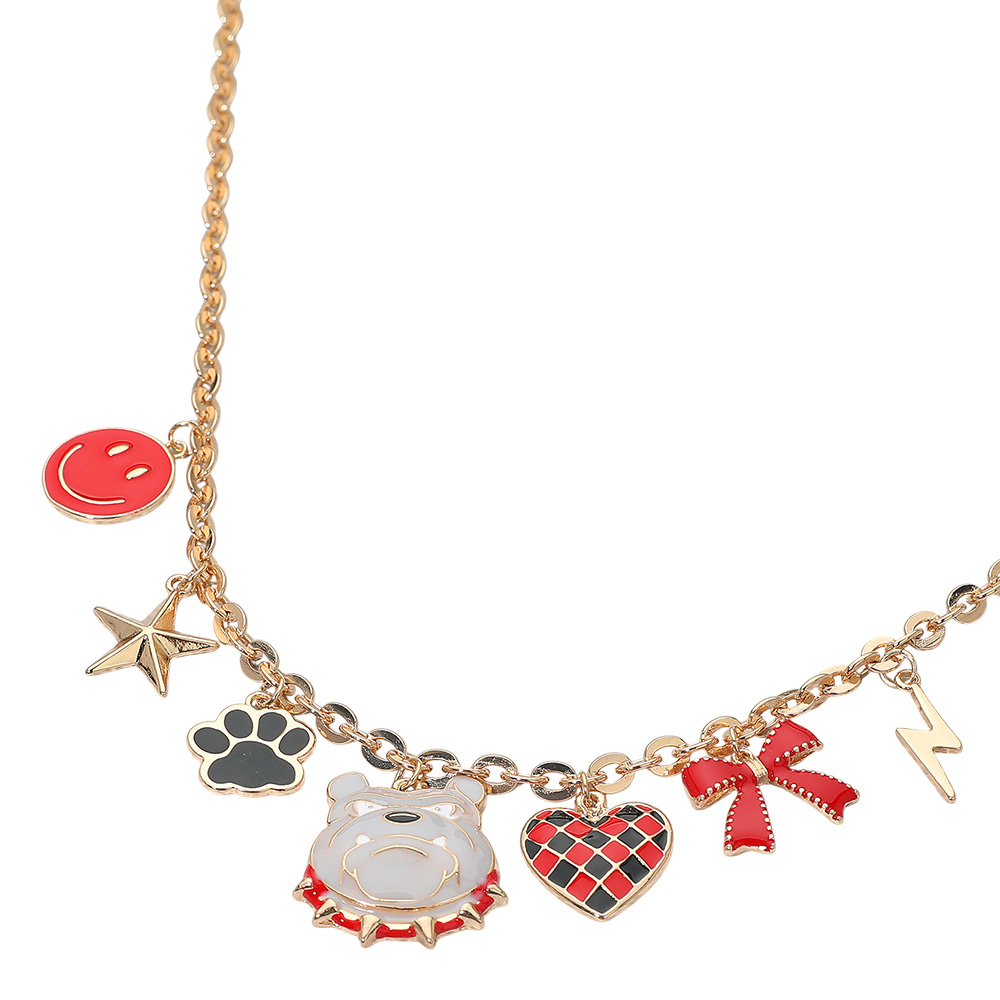 • Necklace featuring playful gameday charms including team mascot animal, paw, heart, bow, star, lightning bolt, and smiley face. A spirited accessory to show team pride, add personality, and complete sporty gameday outfits.