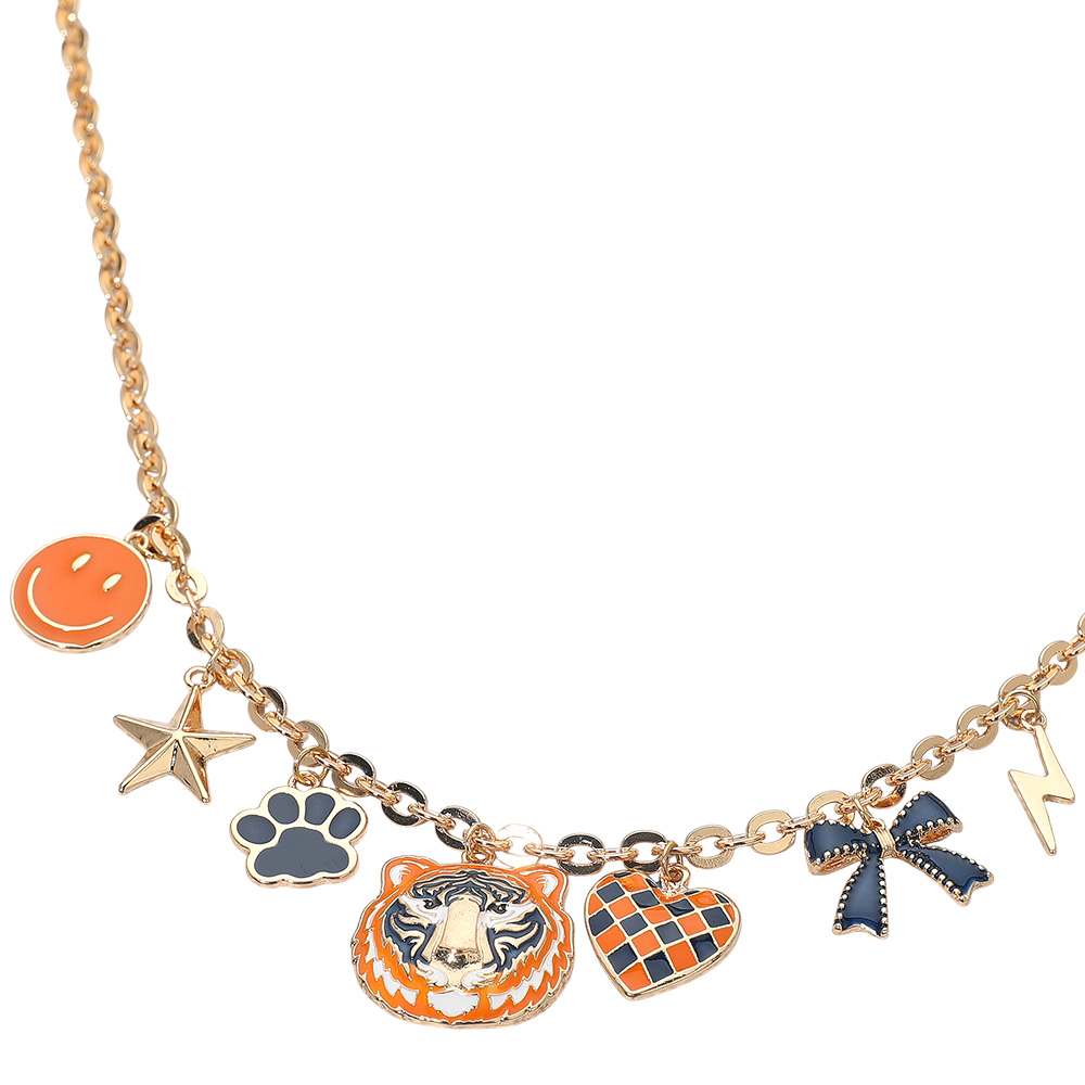 • Necklace featuring playful gameday charms including team mascot animal, paw, heart, bow, star, lightning bolt, and smiley face. A spirited accessory to show team pride, add personality, and complete sporty gameday outfits.