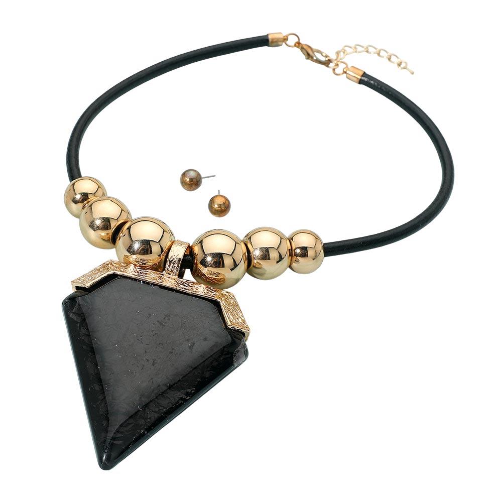 • Turn heads with the Geometric Statement Necklace Set, featuring a striking triangular pendant and polished gold accents. Paired with matching stud earrings, this bold design adds a touch of modern elegance, perfect for elevating evening wear or enhancing any standout look.