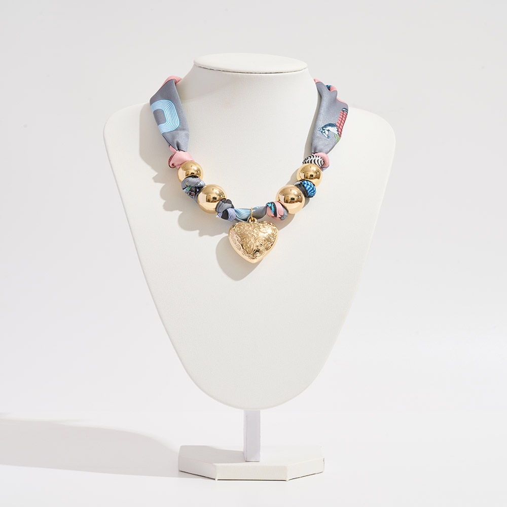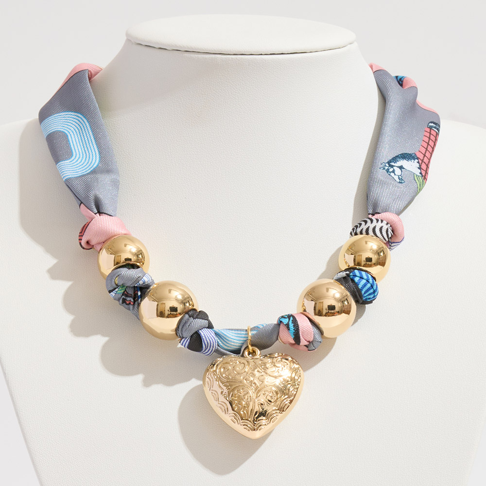 • Versatile scarf accessory styled as a necklace, bracelet, or bag charm. Features a printed scarf with two bold spheres and a textured heart pendant for elegance and charm. Available in 4 unique designs to suit every look, this multifunctional piece adds sophistication.