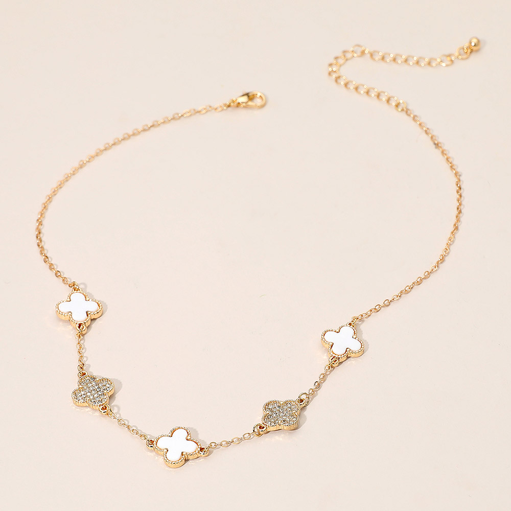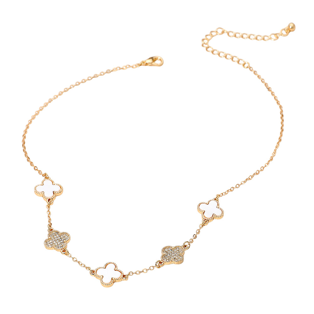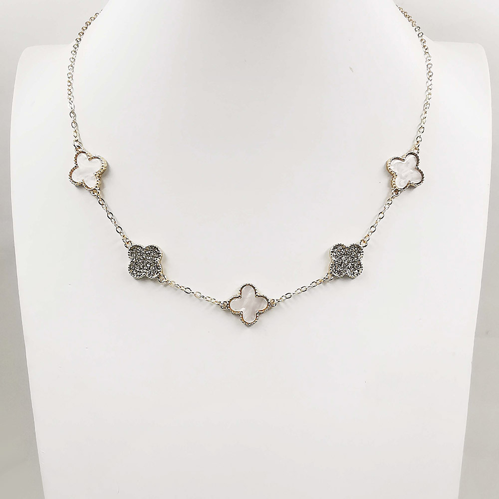 Details • Necklace Size : 15.5" + 3" L • Decor Size : 0.5" L • Add refined elegance to any outfit with this clover charm necklace featuring alternating enamel and crystal-accented charms. Designed with a sleek chain and timeless motif, it’s a versatile piece that complements both casual and dressy looks with effortless sophistication. • Gold Dipped • Lead and Nickel Compliant