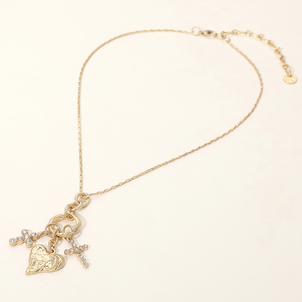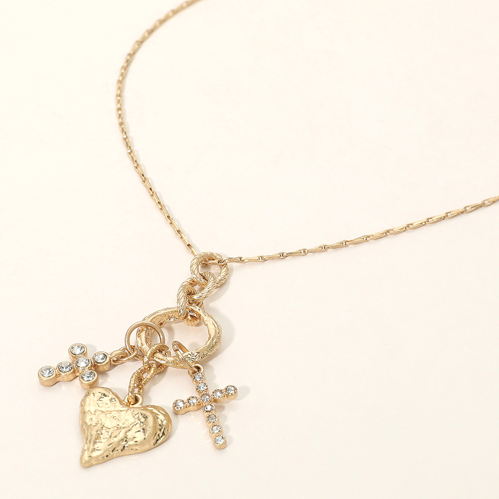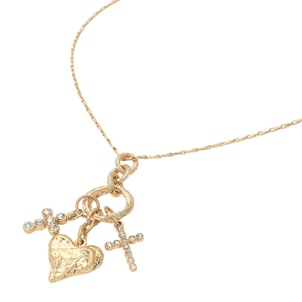Details • Necklace Size : 16" + 3.25" L • Decor Size : 0.8" X 2.5" • This necklace features a layered charm design with a heart and cross pendant suspended from a delicate chain. Designed to add meaning and style, it works effortlessly for everyday wear or special occasions. A versatile accessory that blends symbolic detail with modern fashion appeal, making it a strong addition to curated jewelry collections. • Lead and Nickel Compliant