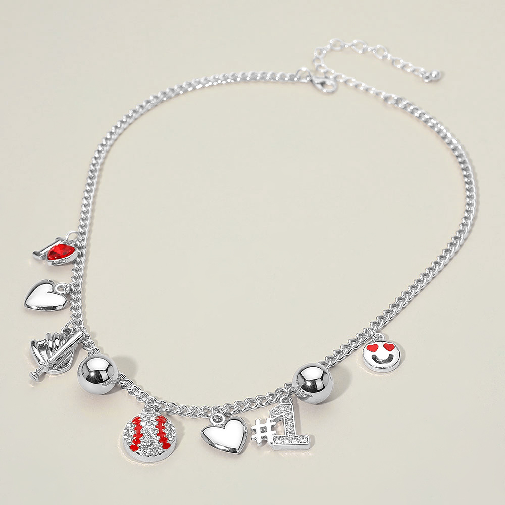 Details • Necklace Size : 16" + 3" L • Decor Size : 1" L • Add fun and personality to your look with this playful charm necklace featuring heart, emoji, and trophy pendants. Designed to capture a youthful spirit, it’s a versatile accessory that blends sparkle and charm, making it perfect for everyday wear or as a cheerful gift. • Lead and Nickel Compliant