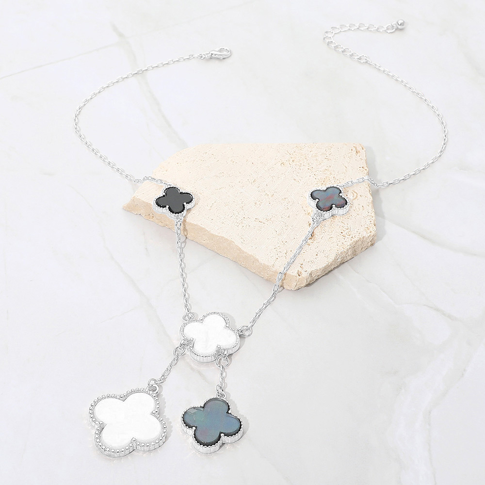 Details • Necklace Size : 16" + 2" L • Decor Size : 3" L • Stylish necklace featuring multiple quatrefoil pendants in a cascading layered design. The elegant drop detail adds movement and sophistication, making it perfect for both casual and formal wear, offering a timeless charm that enhances any outfit effortlessly. • Lead and Nickel Compliant