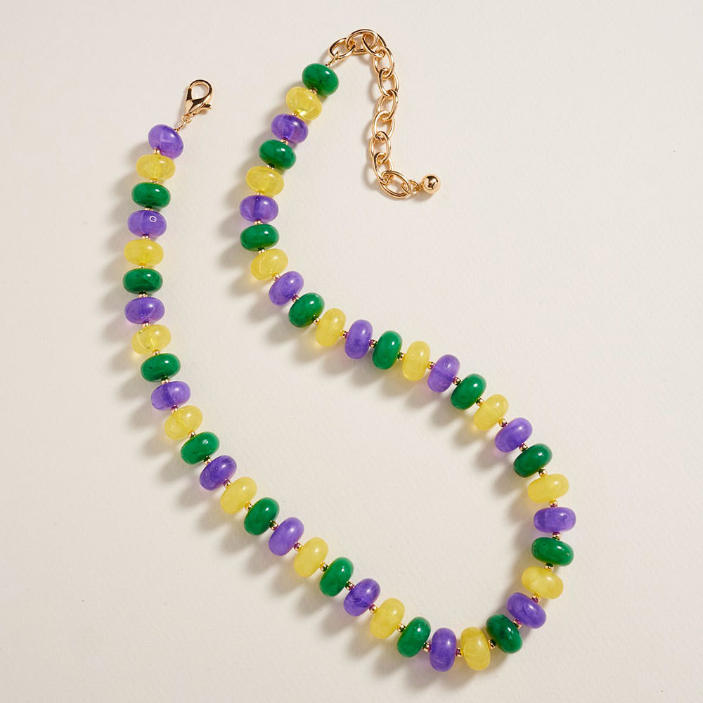 Details • Necklace Size : 18" + 3" L • Decor Size : 0.5" L • Show your festive spirit with this vibrant beaded festival necklace featuring glossy round beads and a secure clasp. Perfect for celebrations, parties, or themed events, it adds playful charm and bold personality to your outfit while offering a comfortable, adjustable fit for any look. • Lead and Nickel Compliant
