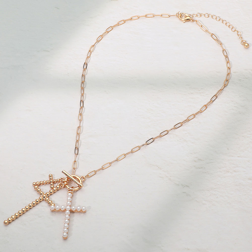 Details • Necklace Size : 16.5" + 3" L • Pendant Size : 1" X 2.25" • Stylish triple cross pendant necklace featuring a chunky link chain with bead and pearl-accented crosses. Its layered, faith-inspired design blends elegance and modern edge, making it a perfect statement accessory for casual, dressy, or spiritual looks. • Lead and Nickel Compliant