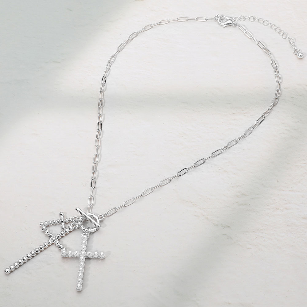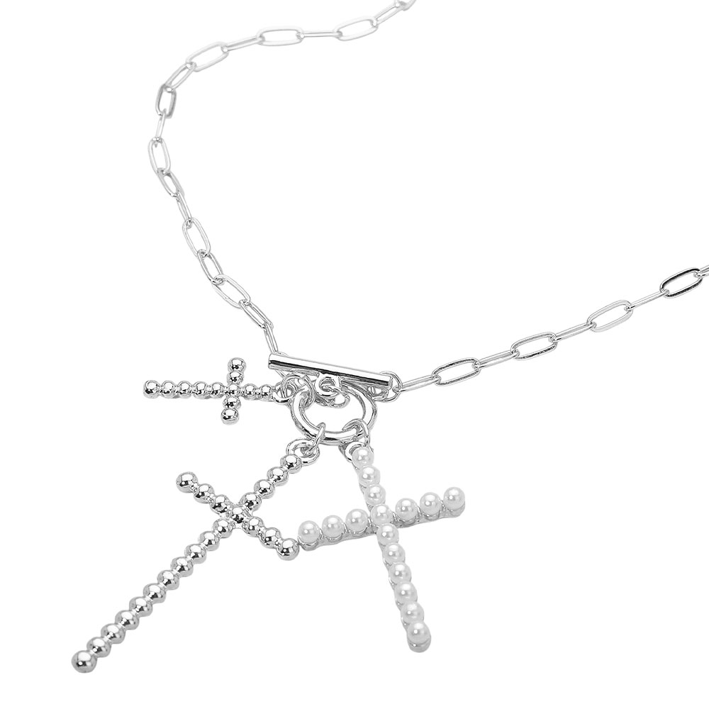 Details • Necklace Size : 16.5" + 3" L • Pendant Size : 1" X 2.25" • Stylish triple cross pendant necklace featuring a chunky link chain with bead and pearl-accented crosses. Its layered, faith-inspired design blends elegance and modern edge, making it a perfect statement accessory for casual, dressy, or spiritual looks. • Lead and Nickel Compliant