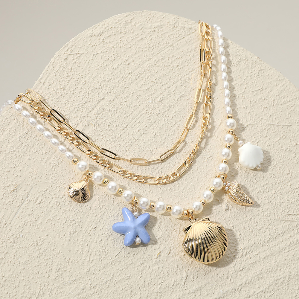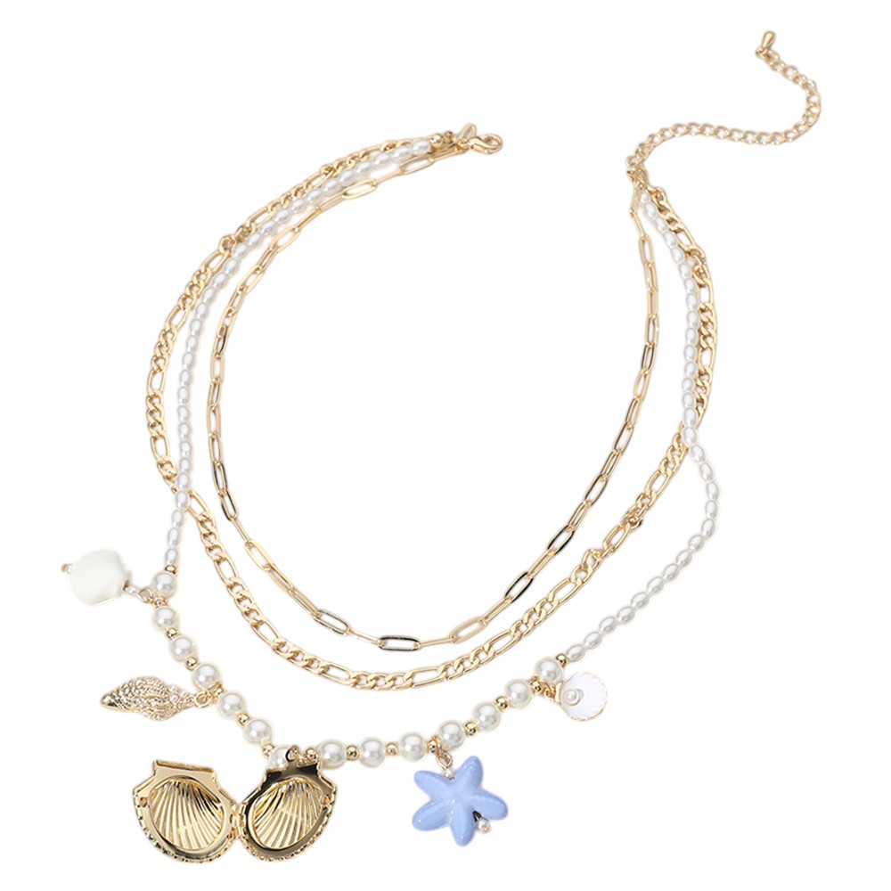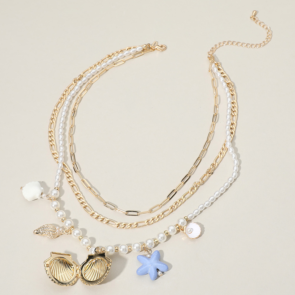 Metal Sea Shell Locket Pendant Puka Shell Ceramic Starfish Charm Station Pearl Paperclip Chain Layered Necklace
