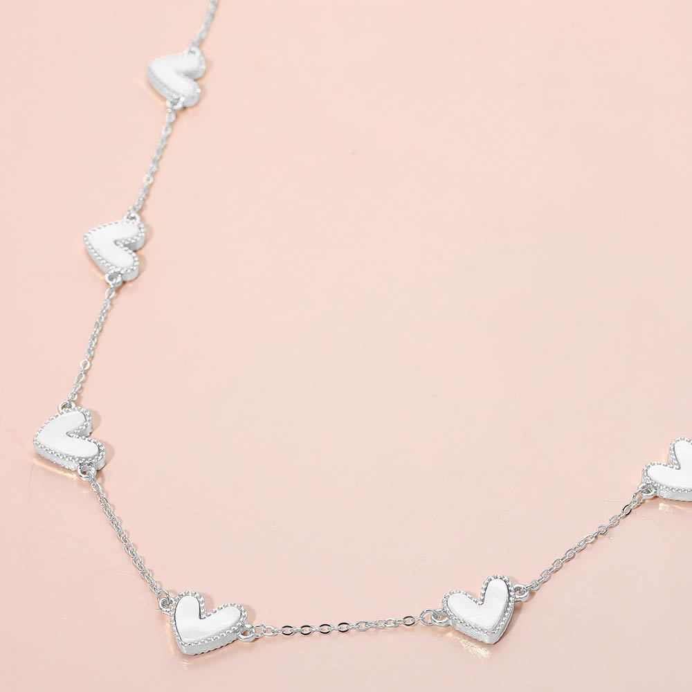 • This heart station link necklace features evenly spaced heart accents connected by a delicate chain for a refined and romantic silhouette. Designed to wear beautifully on its own or layered with other styles, it suits everyday looks, gift collections, and seasonal displays, making it a versatile staple for boutique jewelry assortments.