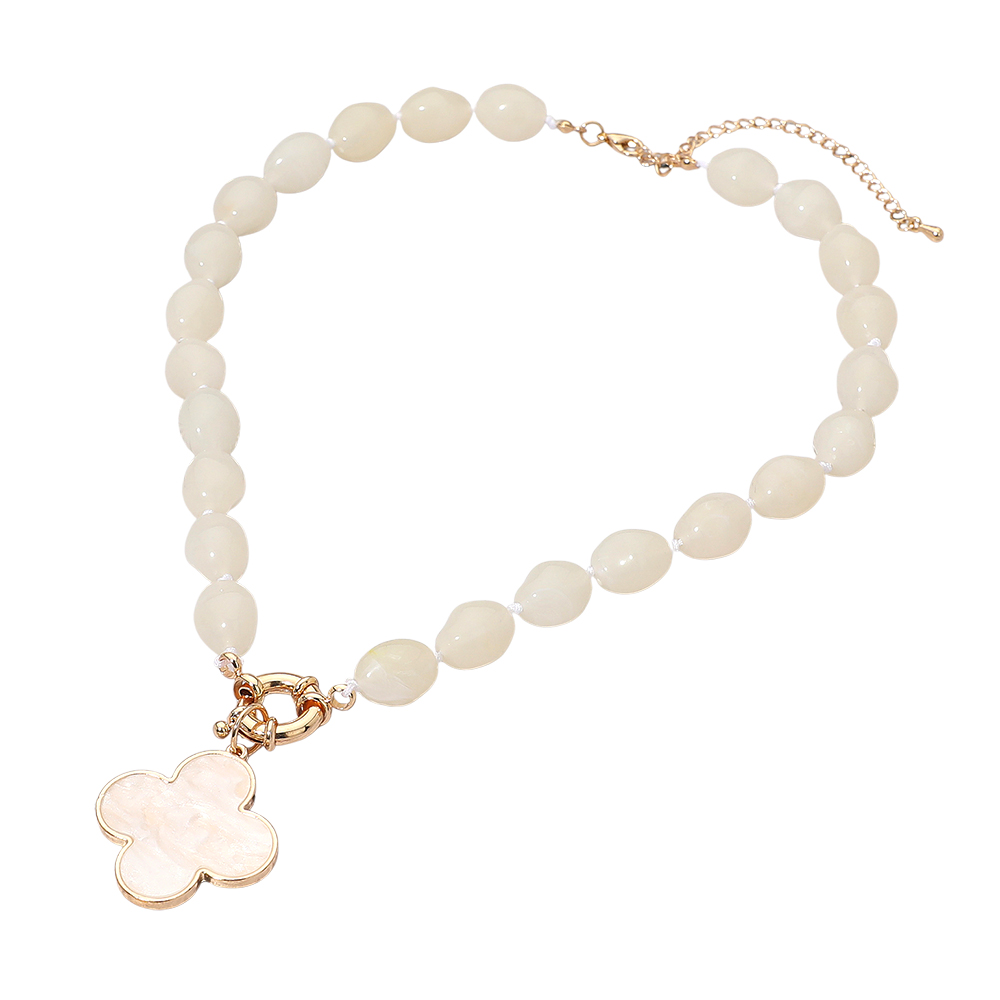 Details • Necklace Size : 16.5" + 3.5" L • Decor Size : 2" L • Charming beaded necklace featuring smooth round beads and a mother of pearl quatrefoil-shaped pendant for a refined, stylish look. Perfect for casual or dressy outfits, adding a touch of sophistication and personality. A versatile accessory that blends modern elegance with timeless appeal. • Lead and Nickel Compliant