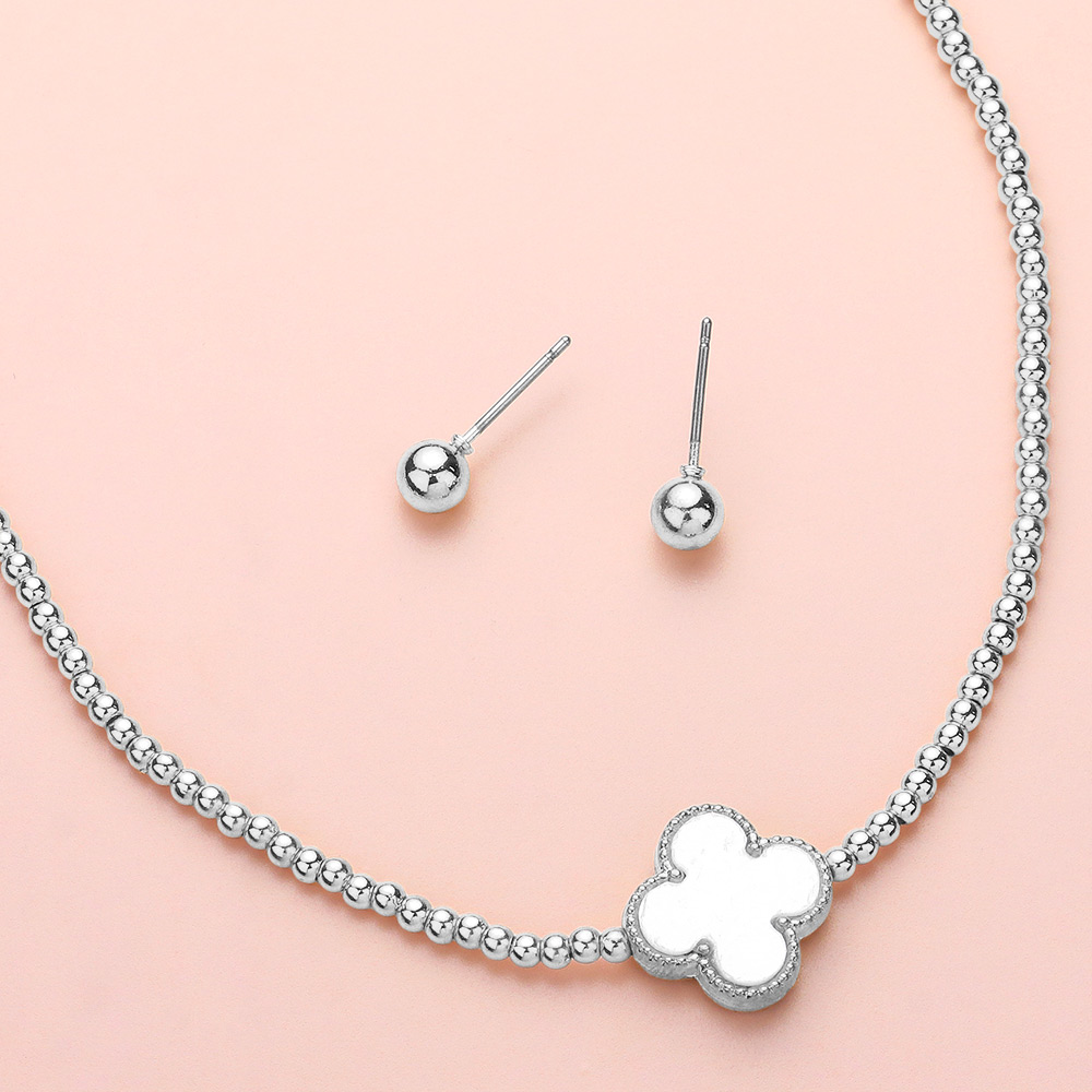 Details • Necklace Size : 14.5" + 3" L • Decor Size : 0.6" L • Earrings Size : 0.2" L • Chic quatrefoil pendant necklace paired with matching stud earrings for a coordinated look. A versatile jewelry set that blends modern elegance with timeless style, perfect for everyday wear or gifting for special occasions. • Lead and Nickel Compliant