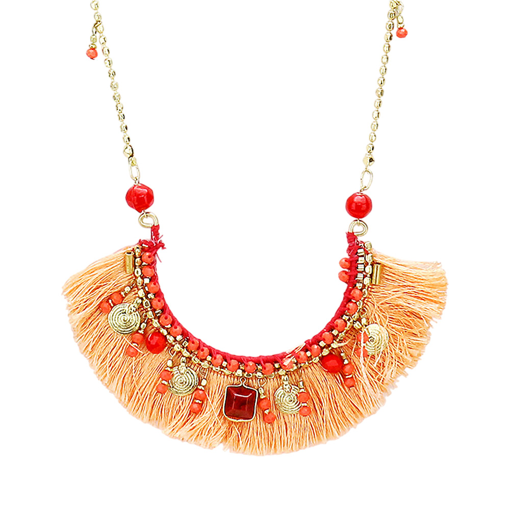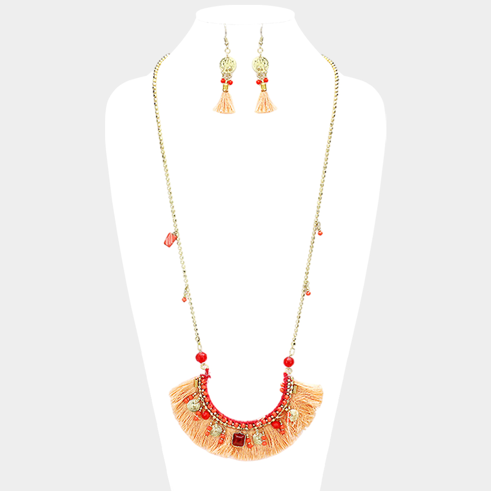 Multi Bead Detail Thread Fringe Long Necklace