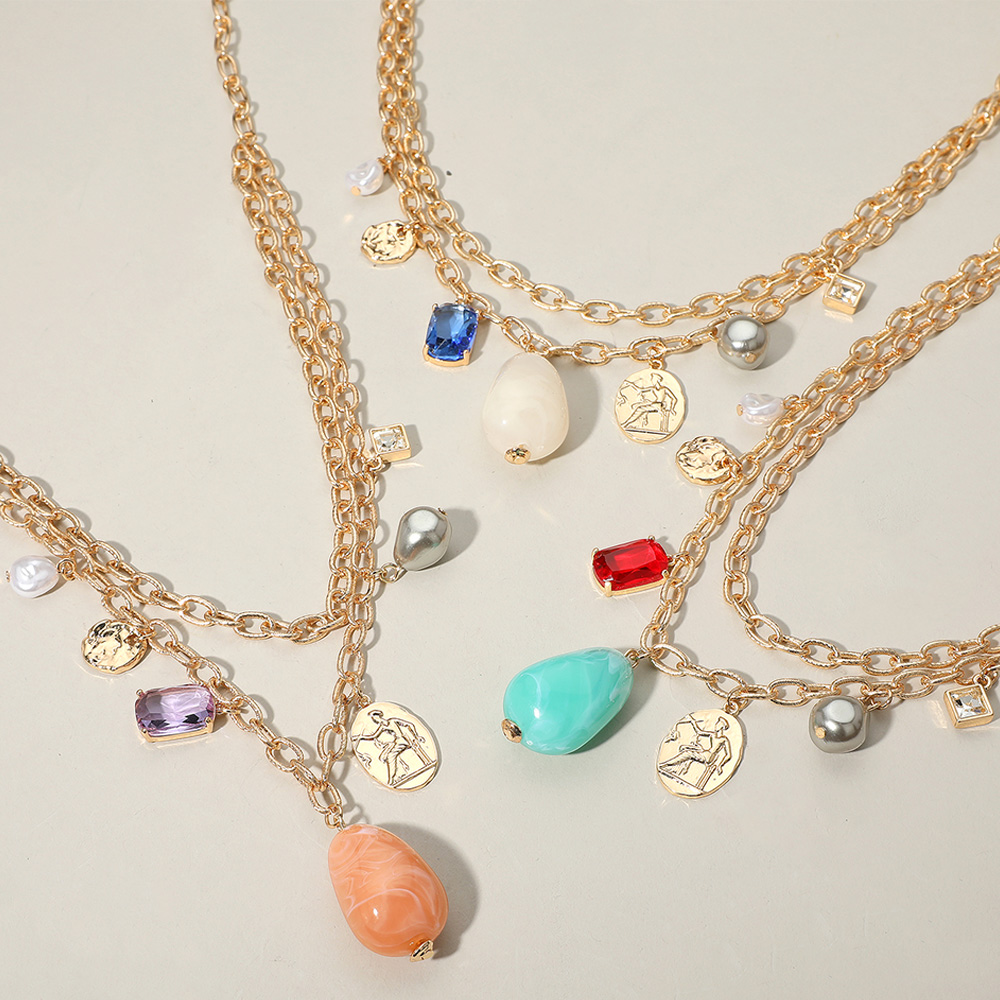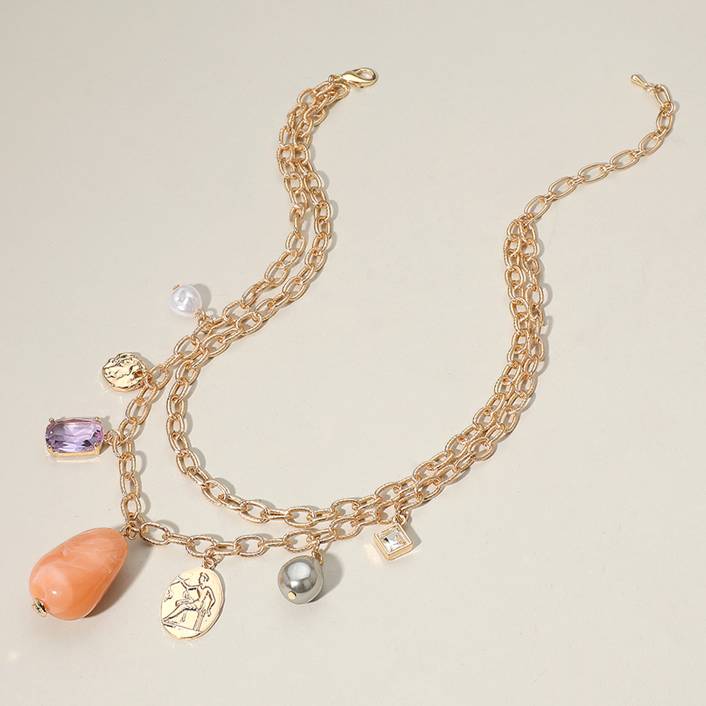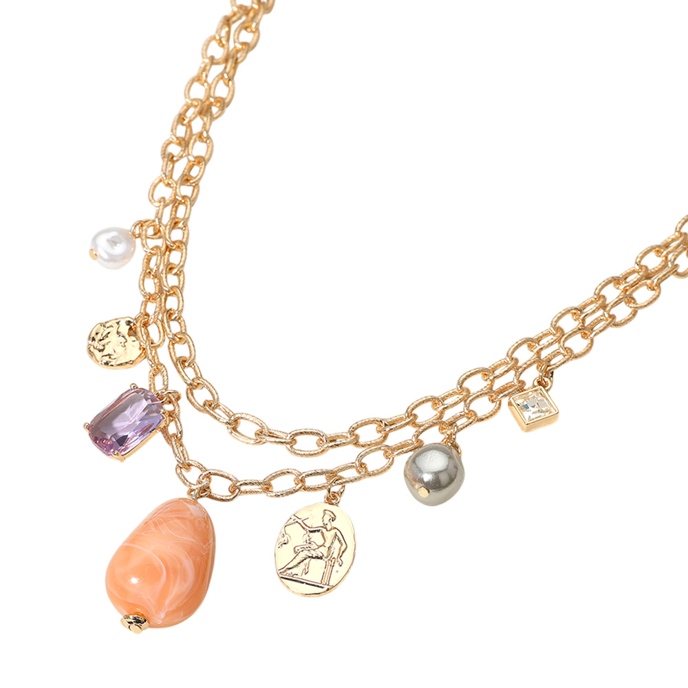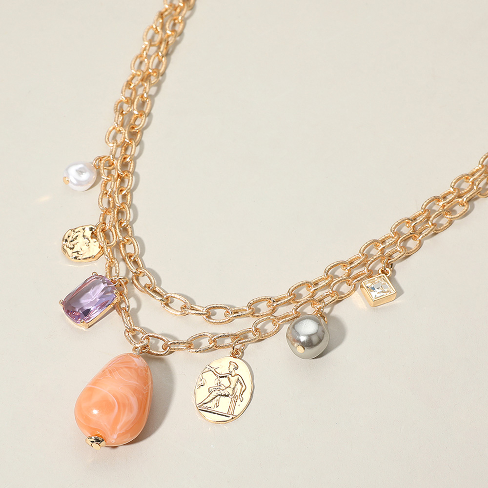 Natural Stone Pearl Metal Coin Stone Cluster Charm Station Double Layered Necklace
