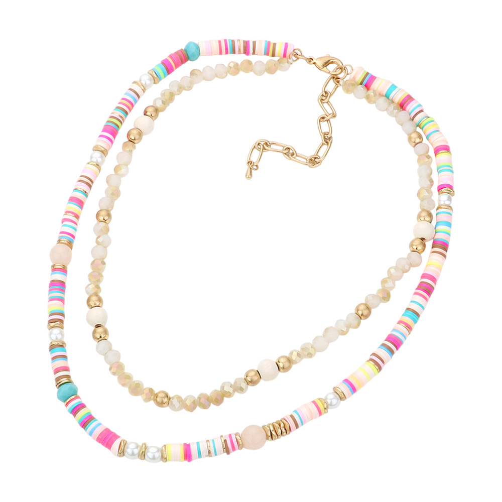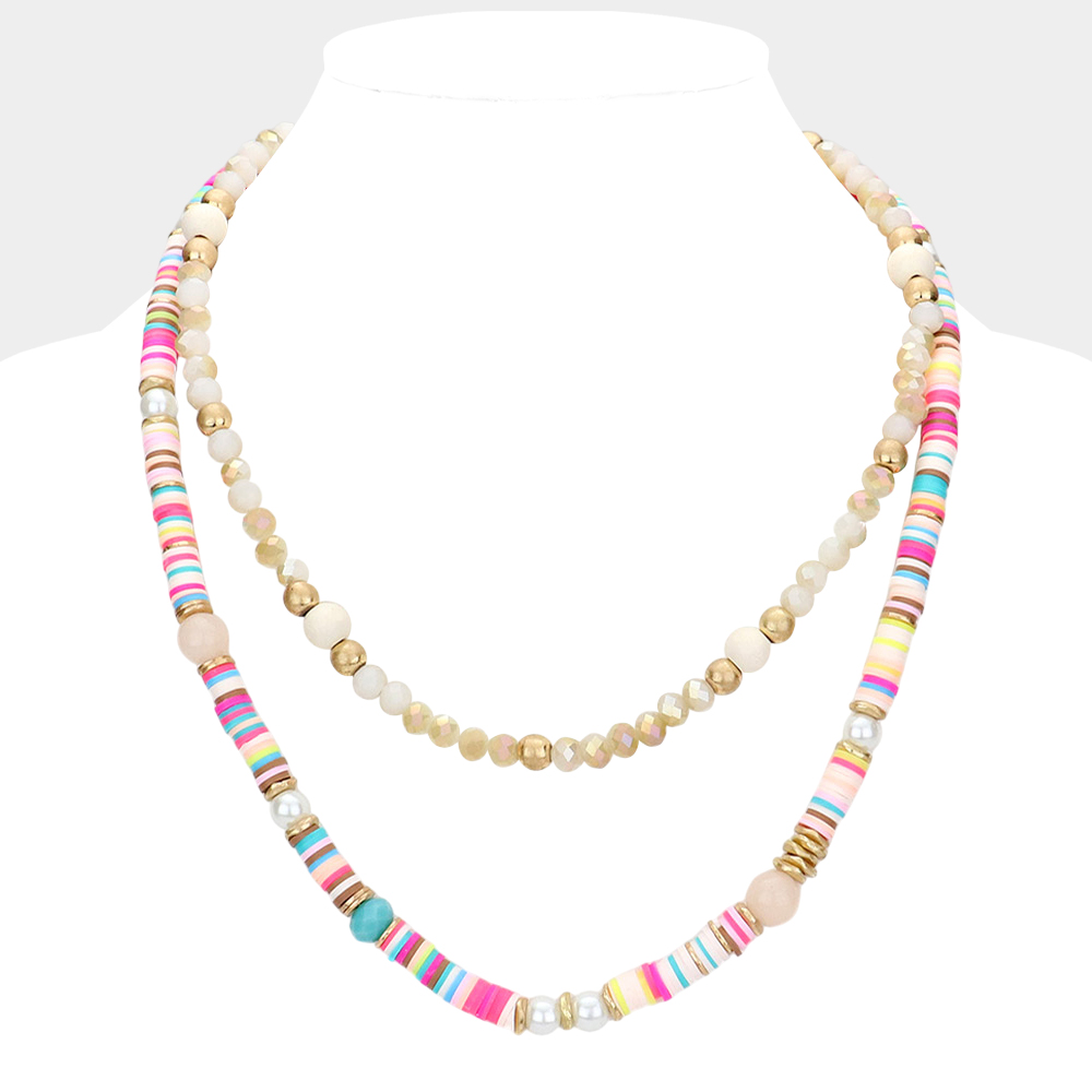 Natural Stone Pearl Wood Pointed Faceted Heishi Beaded Double Layered Necklace