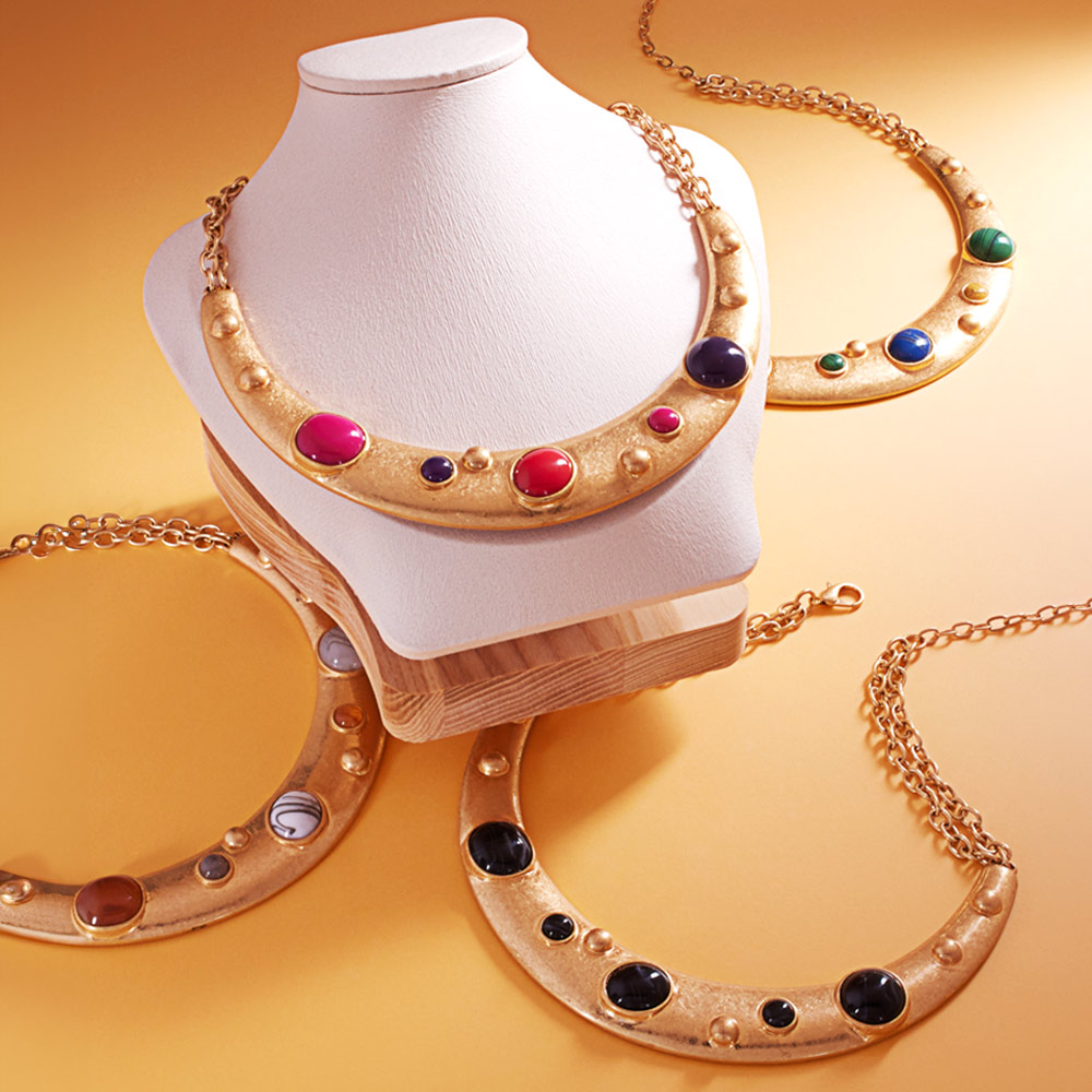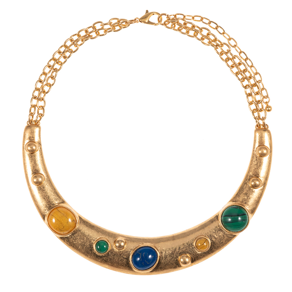 Details • Necklace Size : 15.5" + 3.25" L, 4.6" D • Decor Size : 0.8" L • Stylish collar necklace featuring a textured metal base adorned with round resin details and a secure chain. A bold, artistic accessory perfect for enhancing modern and boho-inspired outfits with unique flair. Ideal for standout everyday or evening looks. • Lead and Nickel Compliant