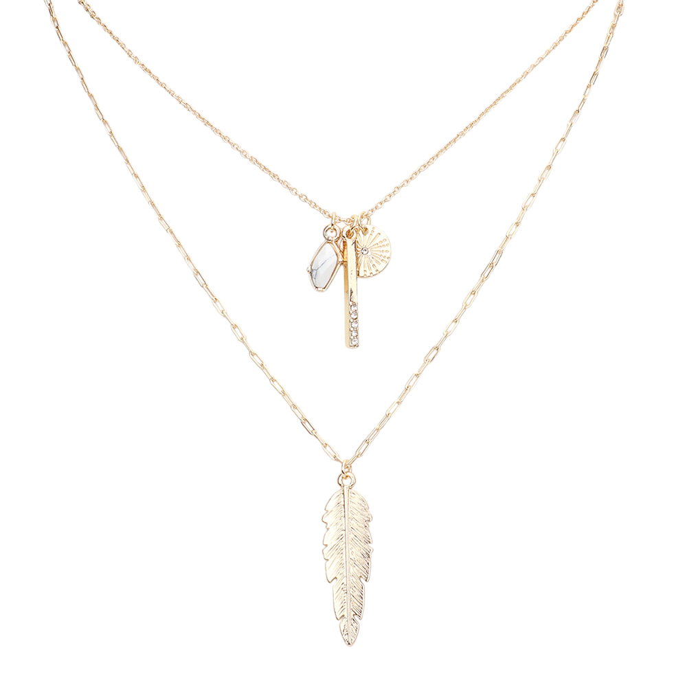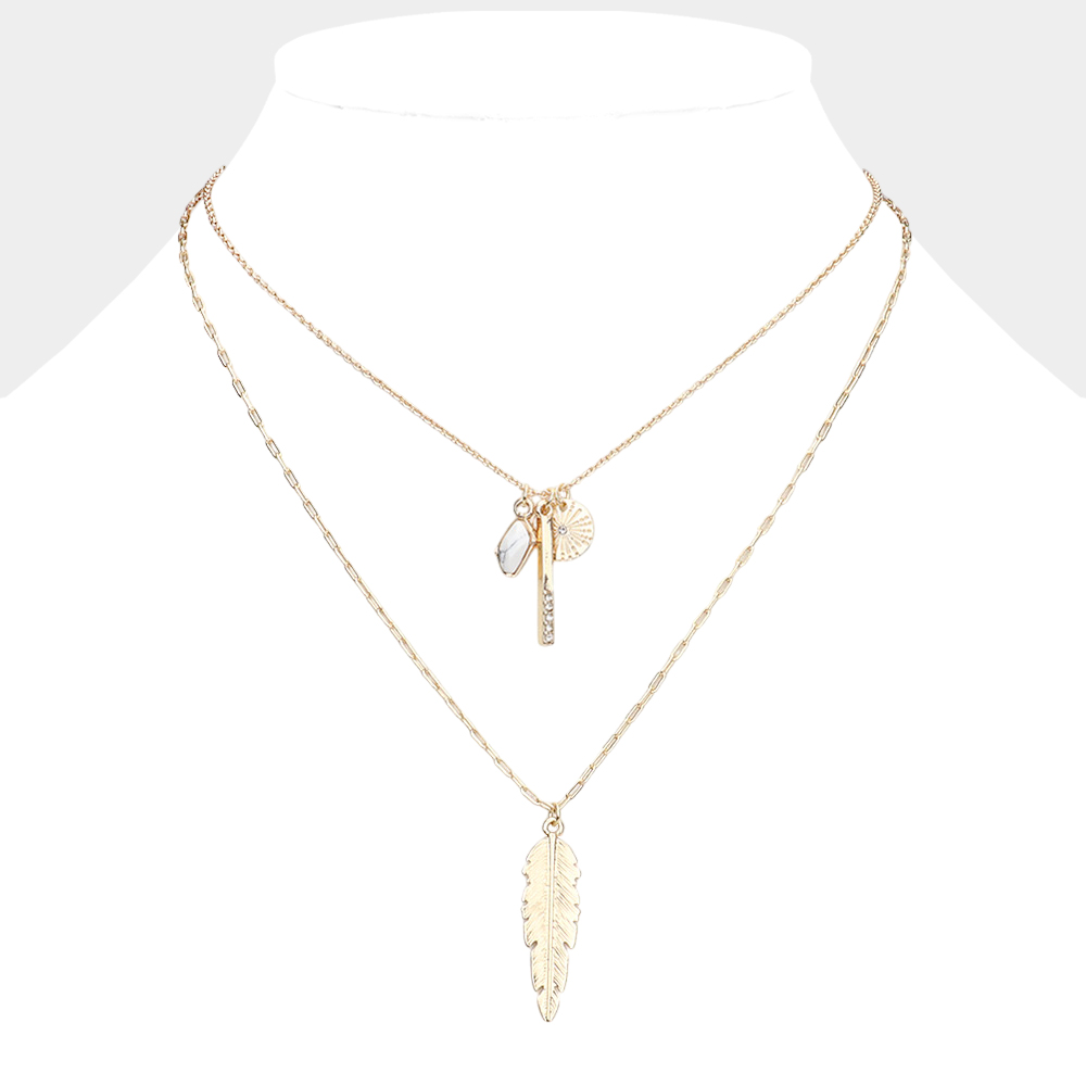 Natural Stone Rhinestone Metal Bar Feather Pendant Double Layered Necklace