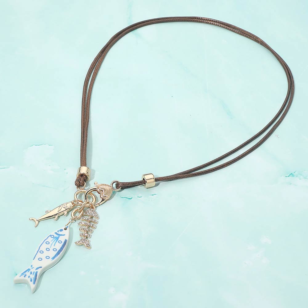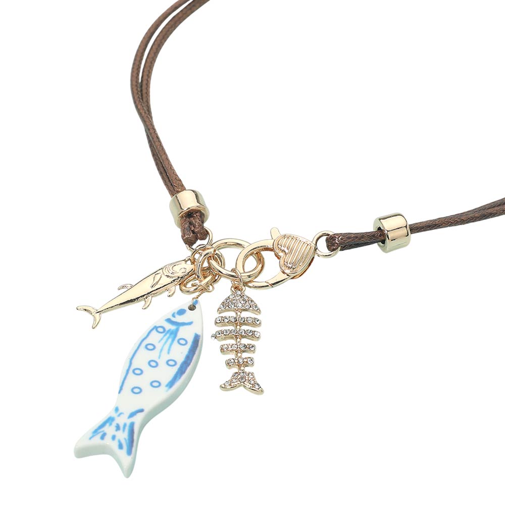 Details • Necklace Size : 20.5" + 0.75" L • Pendant Size : 1.4" L • Ocean-inspired charm necklace featuring playful fish and marine motif accents on an adjustable cord design. A lightweight statement accessory ideal for everyday styling, vacation looks, or beach-themed collections. Perfect for layering or wearing solo to add a whimsical, coastal touch to any outfit. • Lead and Nickel Compliant