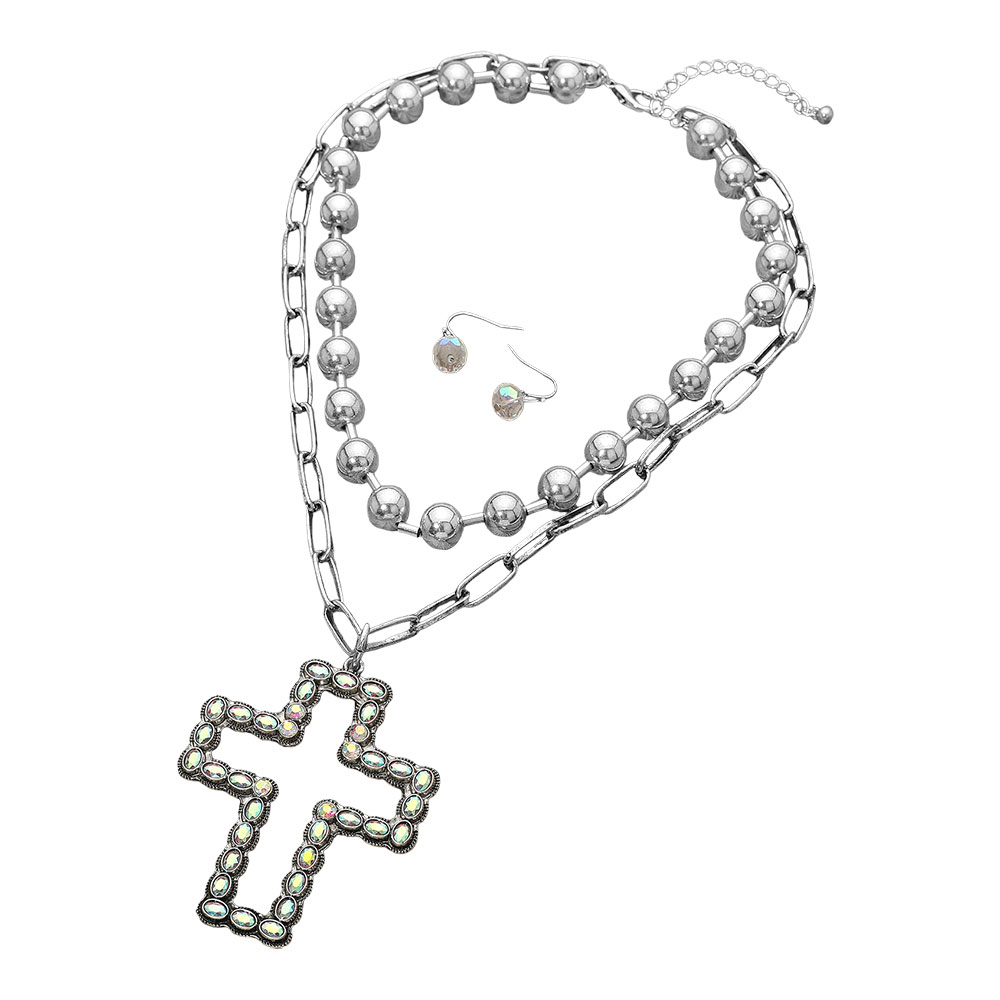 Details • Necklace Size : 18" + 3" L • Decor Size : 6" L • Earrings Size : 1" L • Statement necklace and earring set featuring a bold layered chain with a shimmering cross pendant, perfect for adding edge and style to any outfit. Designed to stand out, this set blends modern chain detail with eye-catching pendant accents for a striking look. • Lead and Nickel Compliant