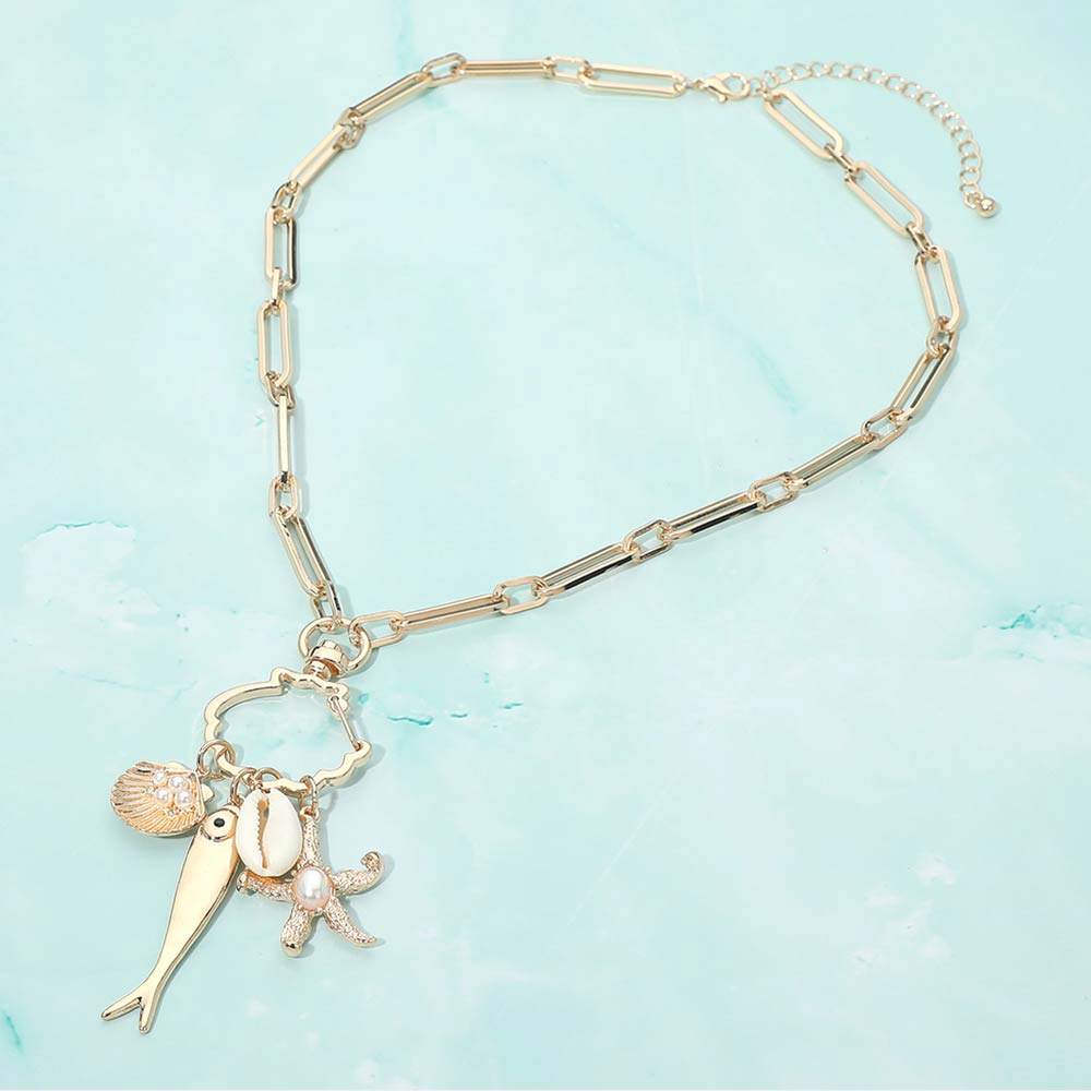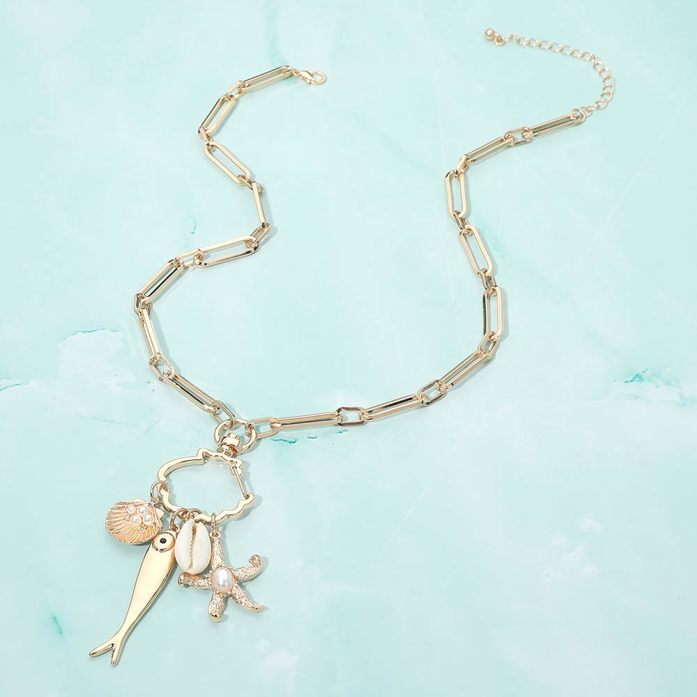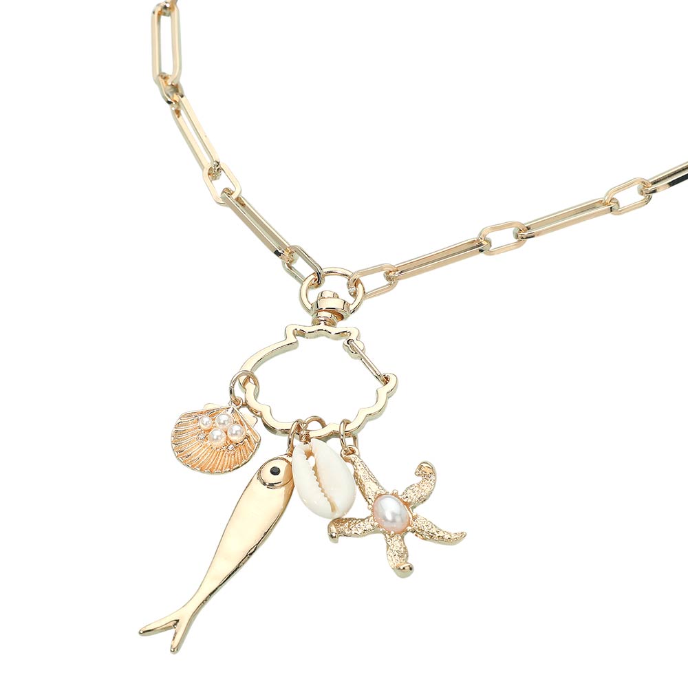 Details • Necklace Size : 18" + 3.25" L • Decor Size : 3.5" L • Charming sea life necklace featuring a bold link chain with playful ocean-inspired charms including fish, shell, and starfish details. Designed for statement styling, this necklace adds a fun coastal touch to everyday outfits, resort looks, or layered accessory collections. Perfect for gift shops and seasonal displays. • Lead and Nickel Compliant