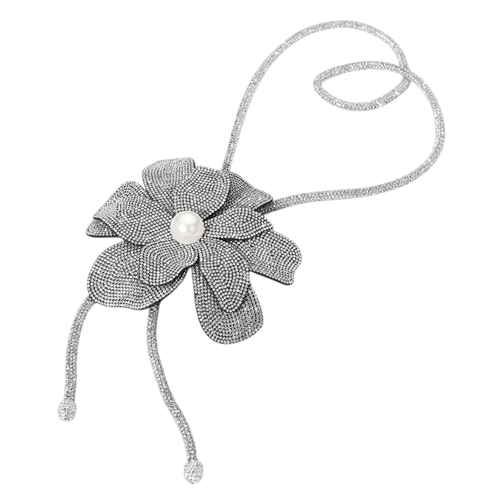 Pearl Centered Bling Studded Flower Pointed Bolo Tie Necklace
