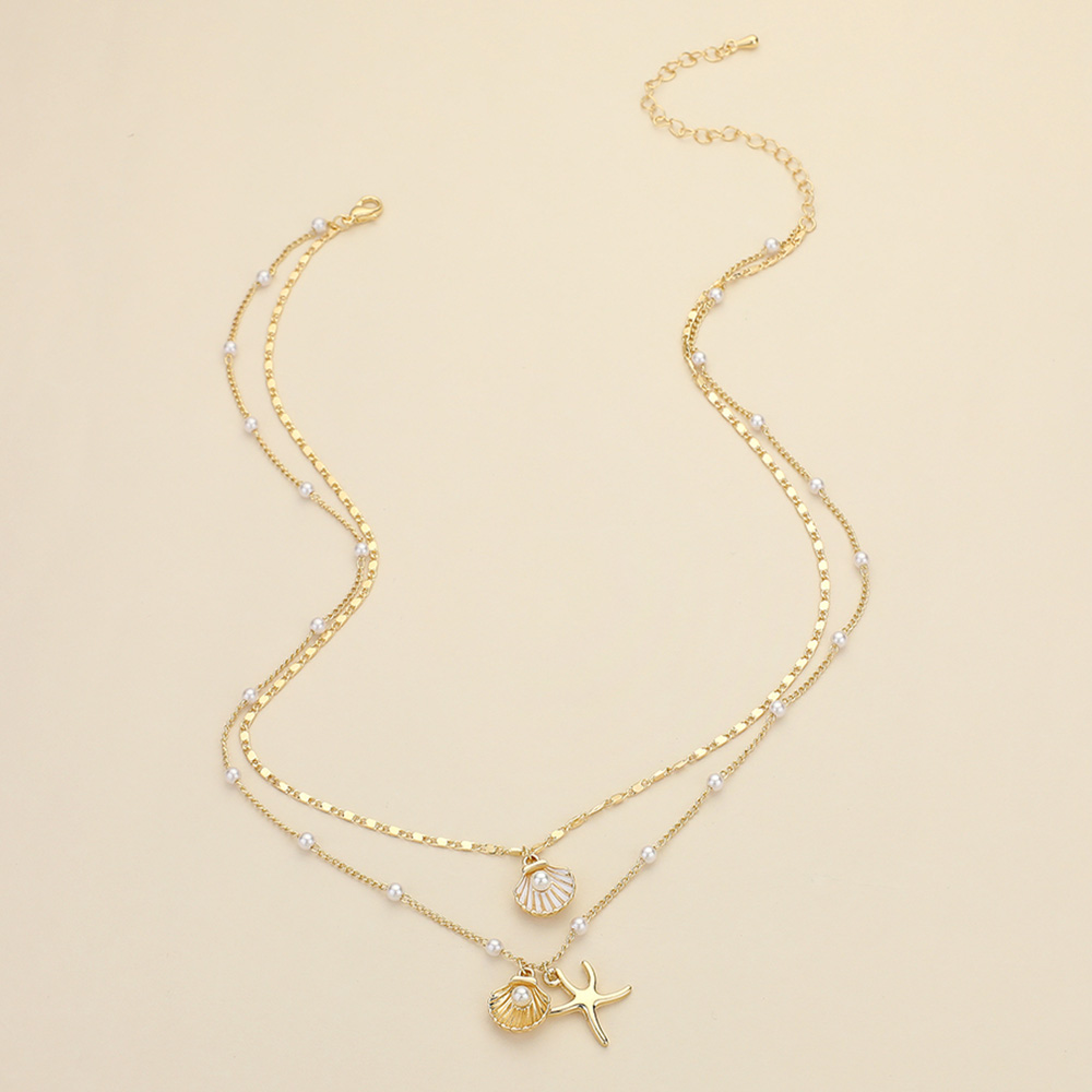 Pearl Shell Metal Starfish Pendant Pearl Station Chain Layered Necklace