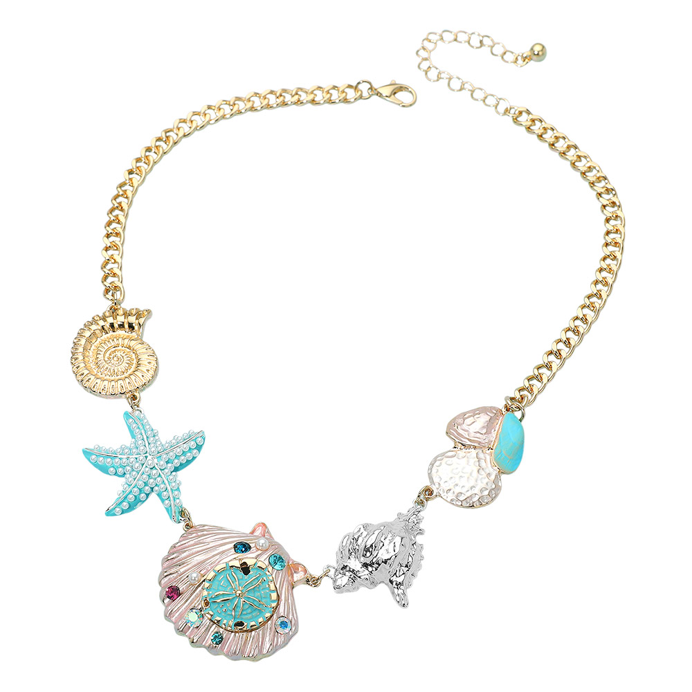 Pearl Studded Starfish Seashell Charm Link Statement Necklace Pearl Studded Starfish Seashell Charm Link Statement Necklace