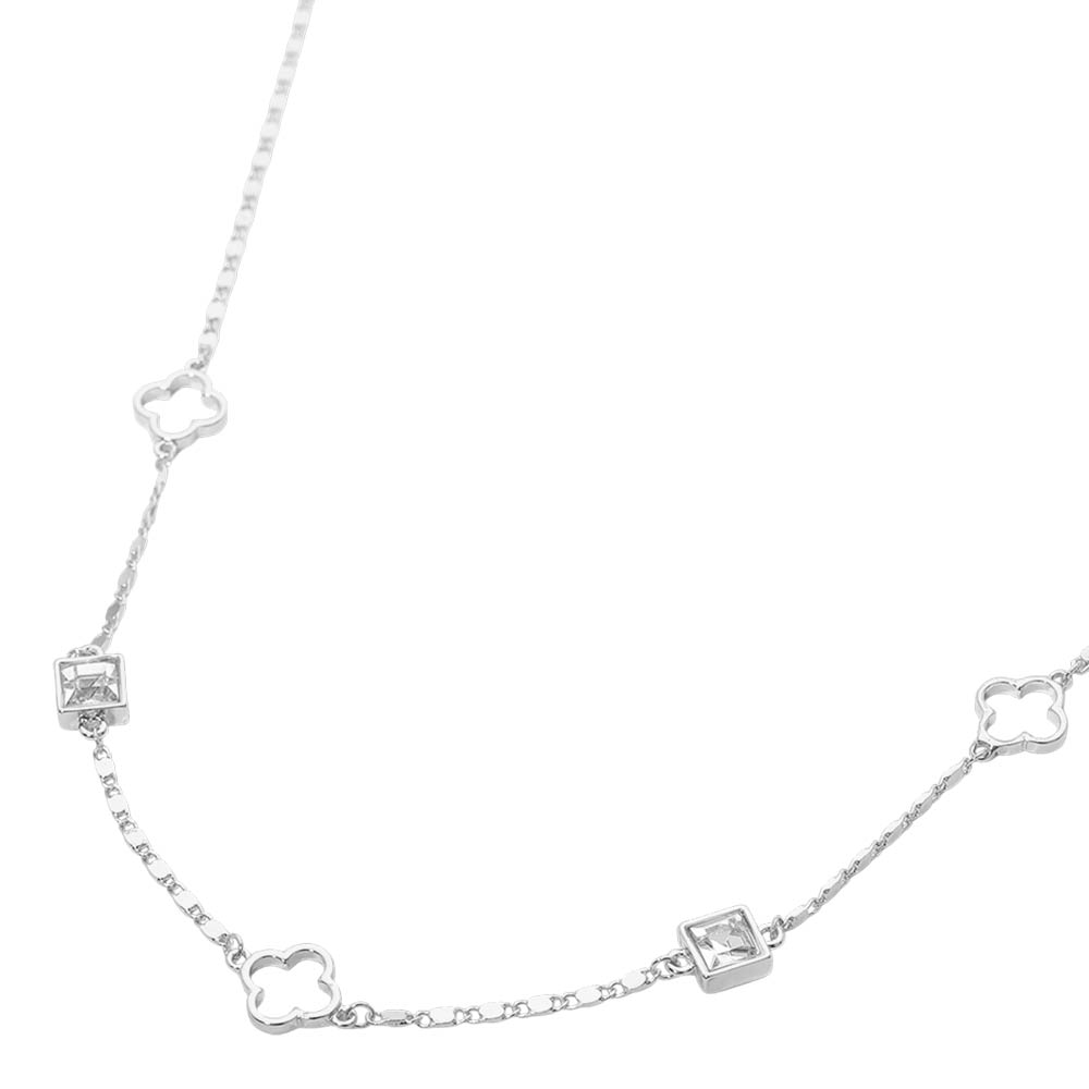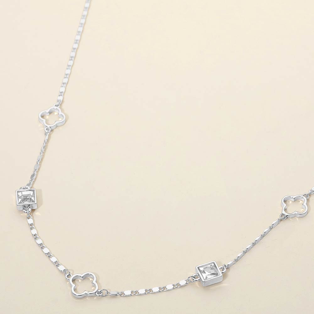Details • Necklace Size : 16" + 3.25" L • Decor Size : 0.5" L • Elegant station necklace featuring evenly spaced quatrefoil links and geometric accents along a delicate chain. Designed to sit beautifully on the neckline, this versatile piece layers effortlessly or shines on its own. A refined accessory ideal for everyday styling, gifting, or boutique collections seeking timeless charm with subtle decorative detail. • Brass • Lead and Nickel Compliant