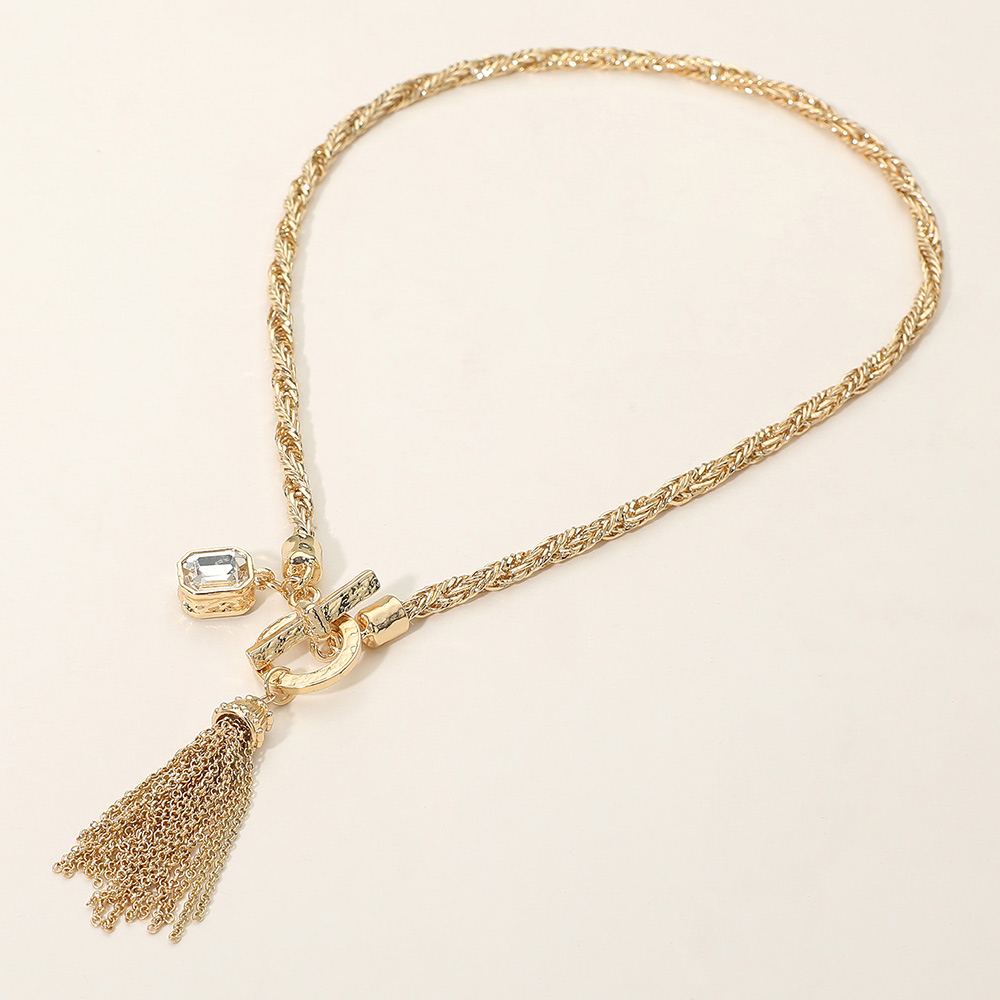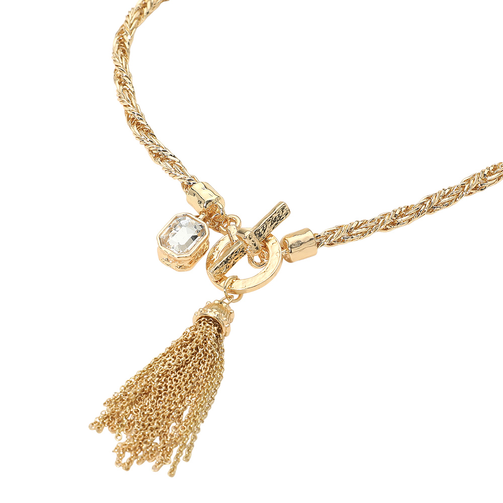 Details • Necklace Size : 17.5" L • Decor Size : 1" X 3" • Toggle Closure • This necklace features a bold braided chain paired with a toggle-style focal accent, highlighted by a dangling tassel and a faceted charm detail. The layered elements create eye-catching movement and texture, making it a standout piece for styling with both casual and dressy looks. Ideal for boutiques seeking statement necklaces with a modern, fashion-forward appeal. • Lead and Nickel Compliant