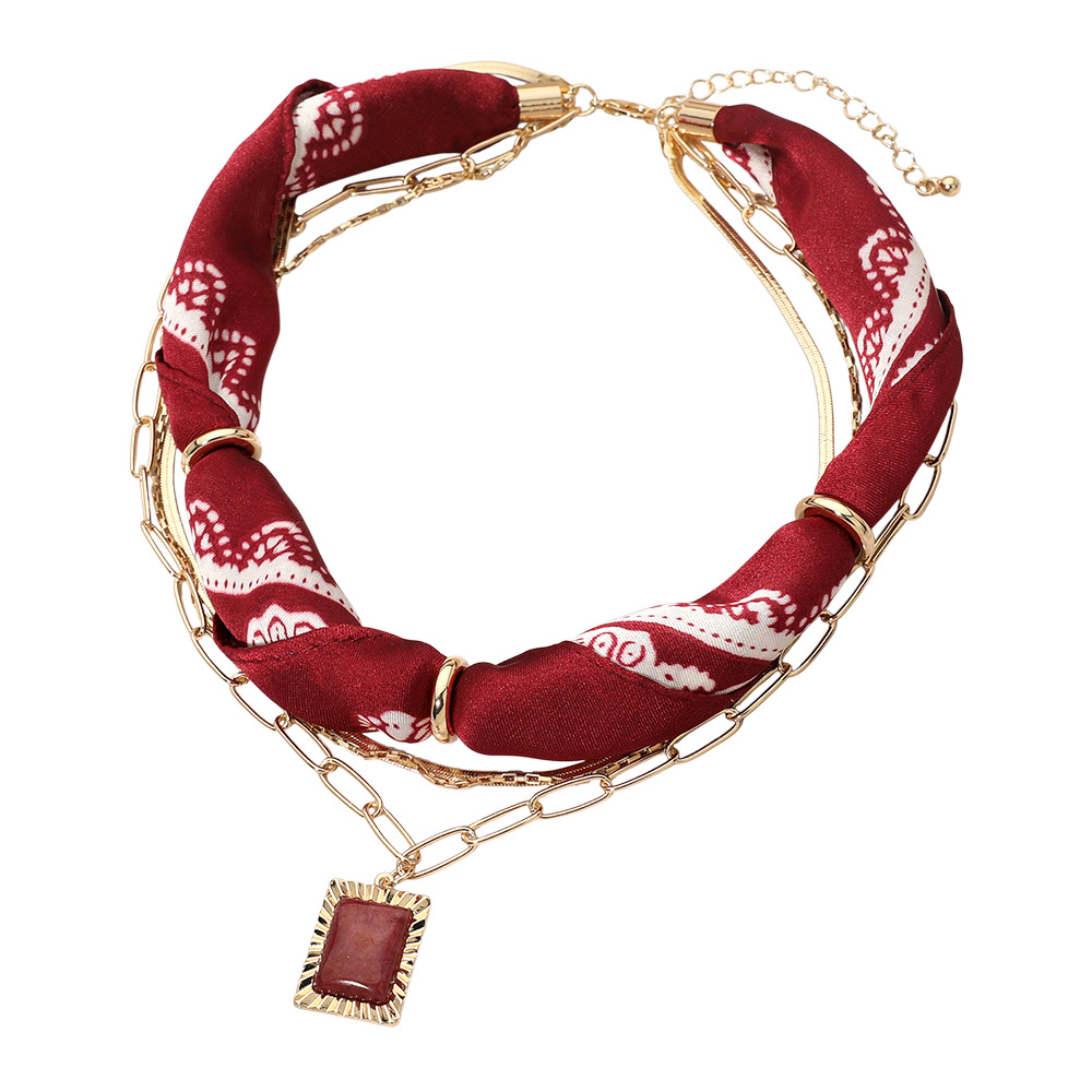Rectangular Stone Pendant Accent Layered Fabric Scarf Necklace Rectangular Stone Pendant Accent Layered Fabric Scarf Necklace