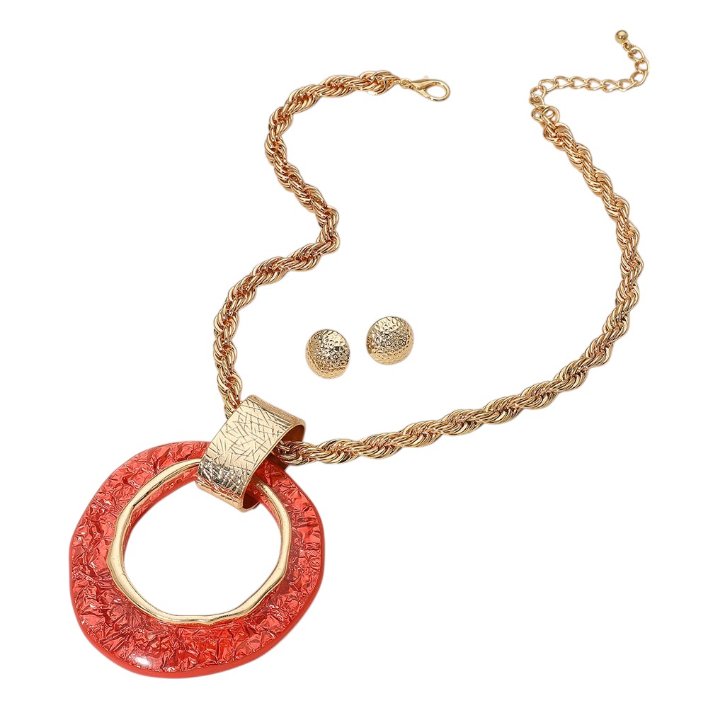 Details • Necklace Size : 20.5" + 3.25" L • Pendant Size : 3.4" X 4" • Earrings Size : 0.7" L • Modern pendant necklace and earring set featuring a bold textured circular pendant on a chunky chain. Perfect statement jewelry for parties, evenings out, or elevating casual looks, this set brings an artistic edge and sophisticated flair to any outfit with its unique, contemporary design. • Lead and Nickel Compliant