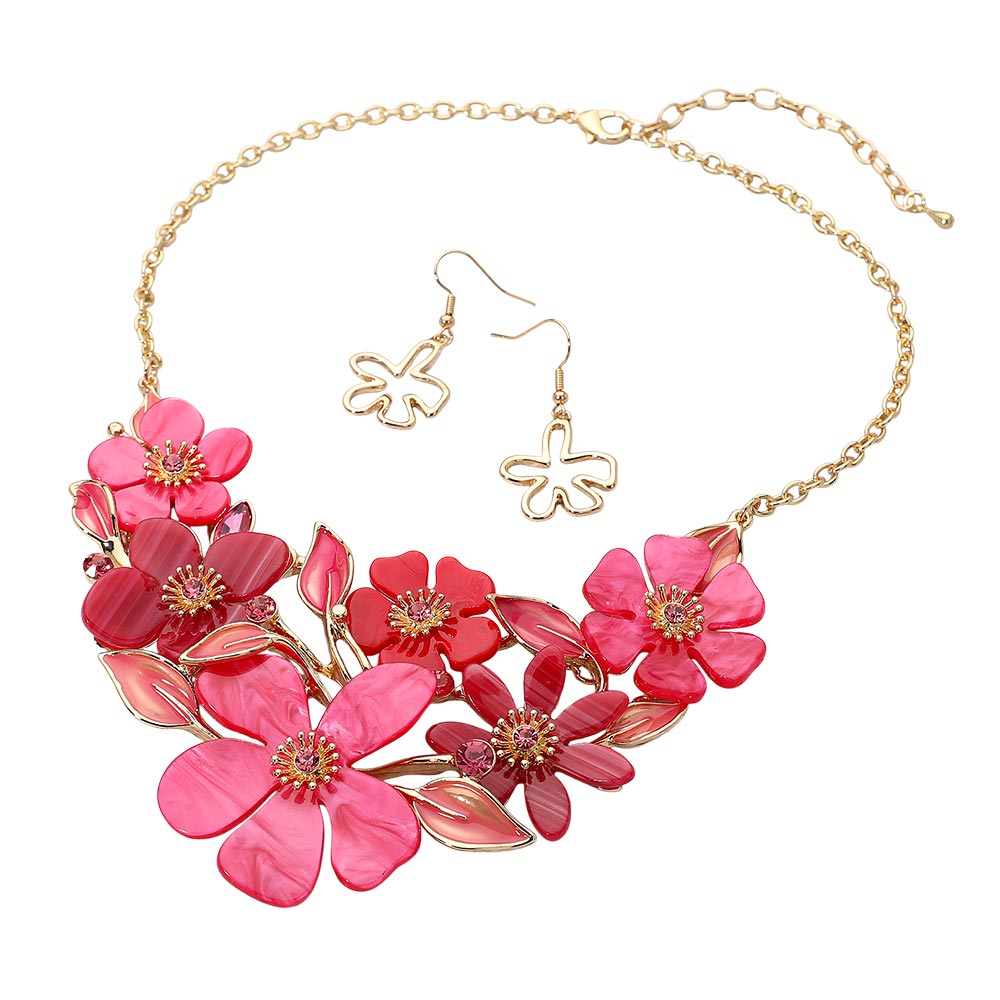 Details • Necklace Size : 18" + 3" L • Decor Size : 2.9" L • Earrings Size : 1.75" L • This floral statement necklace and earring set showcases beautifully layered petals and delicate leaf accents, creating a bold yet elegant look. Perfect for special occasions or evening events, this coordinated set adds a sophisticated, feminine charm that enhances any ensemble. • Lead and Nickel Compliant