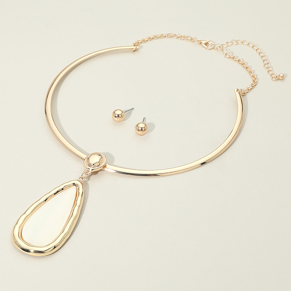 Details • Necklace Size : 16" + 3.25" L • Pendant Size : 1.2" X 3.25" • Earrings Size : 0.3" L • This teardrop pendant collar necklace and stud earring set delivers a clean, modern statement with a sleek curved collar and bold drop accent. Designed for boutique collections, it offers effortless styling for everyday wear, special occasions, gifting, and polished fashion looks. • Lead and Nickel Compliant