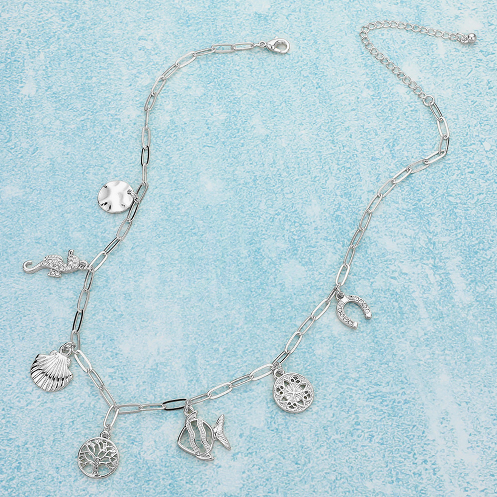 Details • Necklace Size : 16" + 3.25" L • Decor Size : 1.1" L • This ocean inspired charm necklace features playful pendants including seashell, seahorse, dolphin, and other marine symbols on a modern linked chain. A stylish accessory that brings seaside vibes to your everyday look or adds a unique accent to special occasions. • Lead and Nickel Compliant