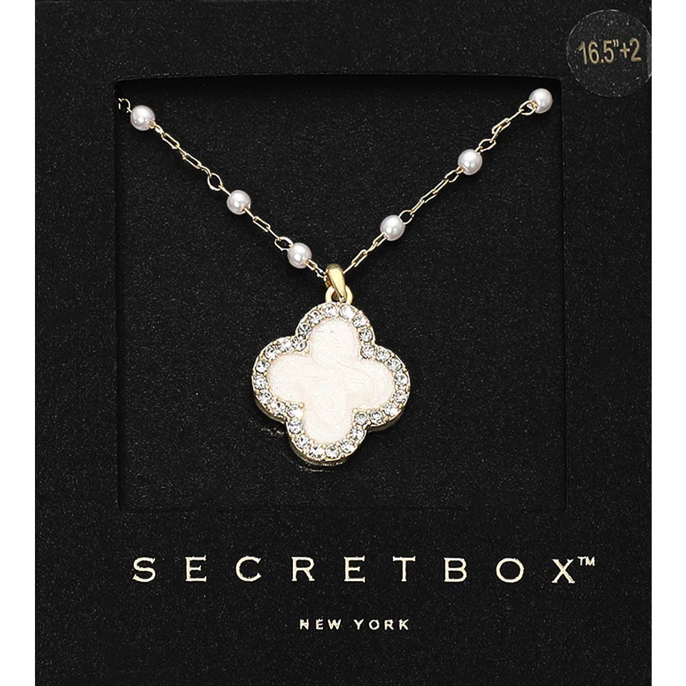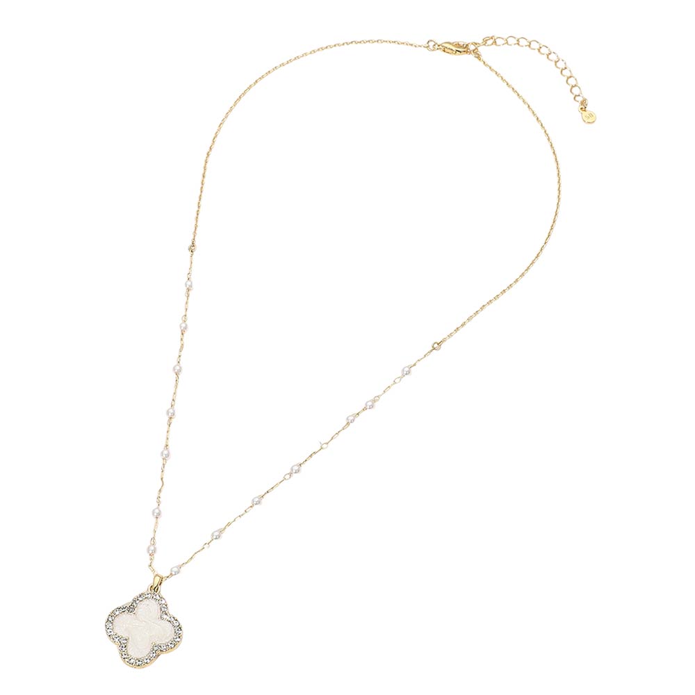 Details • Necklace Size : 16.5" + 2" • Pendant Size : 0.7" X 0.75" • Elegant station necklace featuring a quatrefoil-shaped charm accented with sparkling crystal details and spaced bead stations along a delicate chain. Designed with an adjustable length for versatile styling, this necklace adds a refined decorative touch to everyday outfits, gifting collections, or boutique jewelry displays. • Gold Dipped
