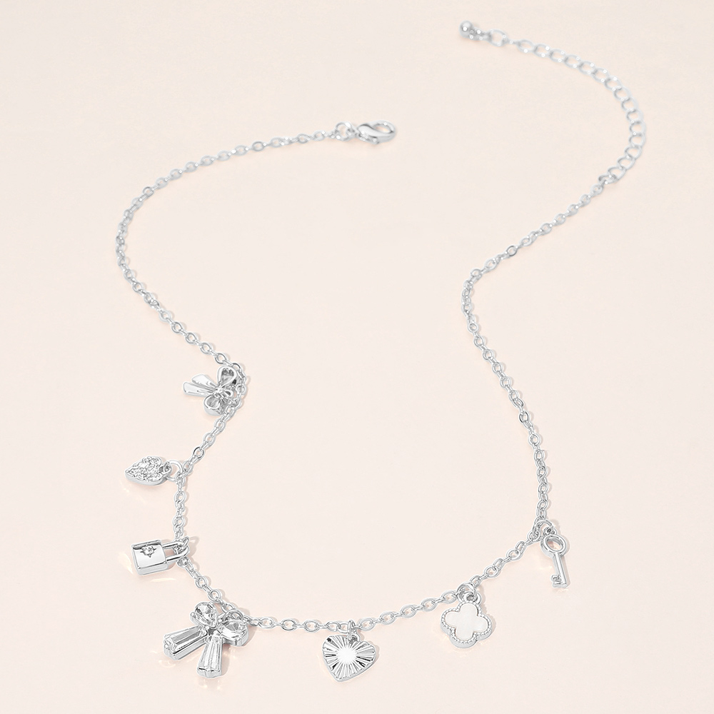 Details • Necklace Size : 16" + 3" L • Decor Size : 0.6" L • This charm necklace features a playful mix of heart, bow, key, lock, and symbolic accents arranged along a delicate chain for a stylish layered look. Designed to add personality and charm to everyday outfits, it’s perfect for boutique displays, gifting, or trend driven collections focused on romance, luck, and statement accessories. • Sterling Silver Dipped • Lead and Nickel Compliant