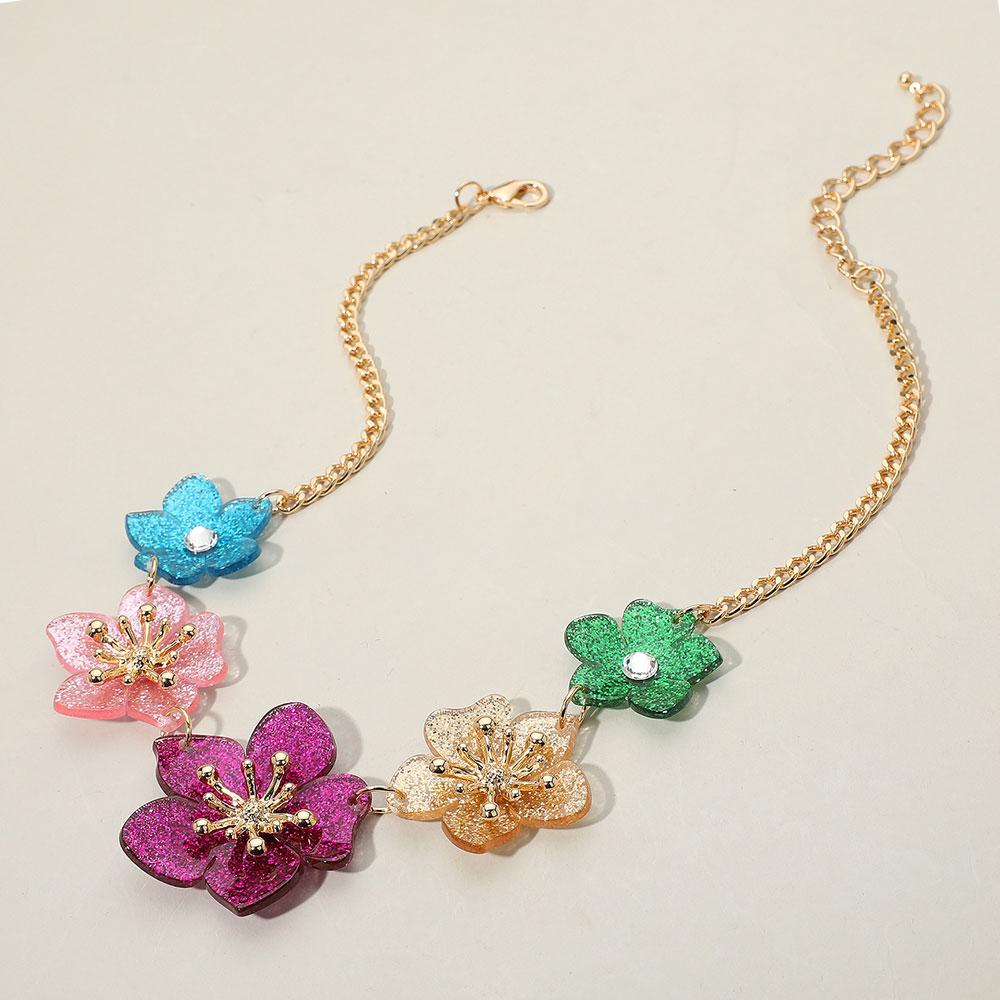 Details • Necklace Size : 18.5" + 3" L • Decor Size : 2" L • Bold floral necklace featuring a series of shimmering flower accents with textured finishes and crystal details. Attached to a gold-tone chain with adjustable length, it brings a vibrant, statement-making flair to any outfit. Ideal for festive events, parties, or standout everyday style. • Lead and Nickel Compliant