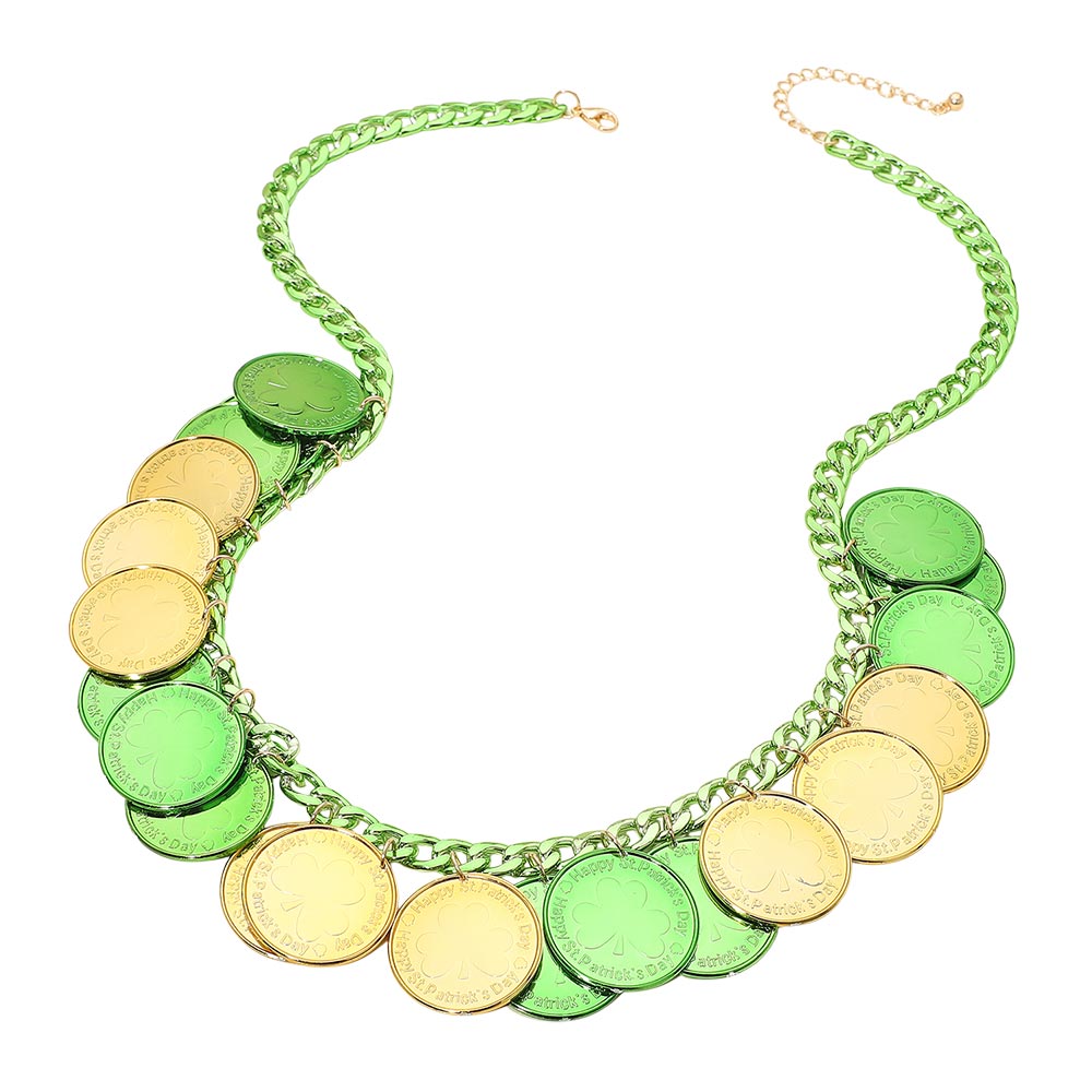 • Eye-catching statement necklace featuring layered coin charms with lucky-inspired symbols and bold movement. Designed to stand out at St. Patrick’s Day celebrations, themed parties, and festive events, this necklace adds playful personality and dramatic flair to holiday outfits and seasonal displays.