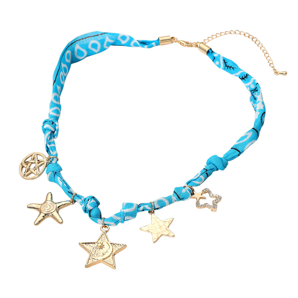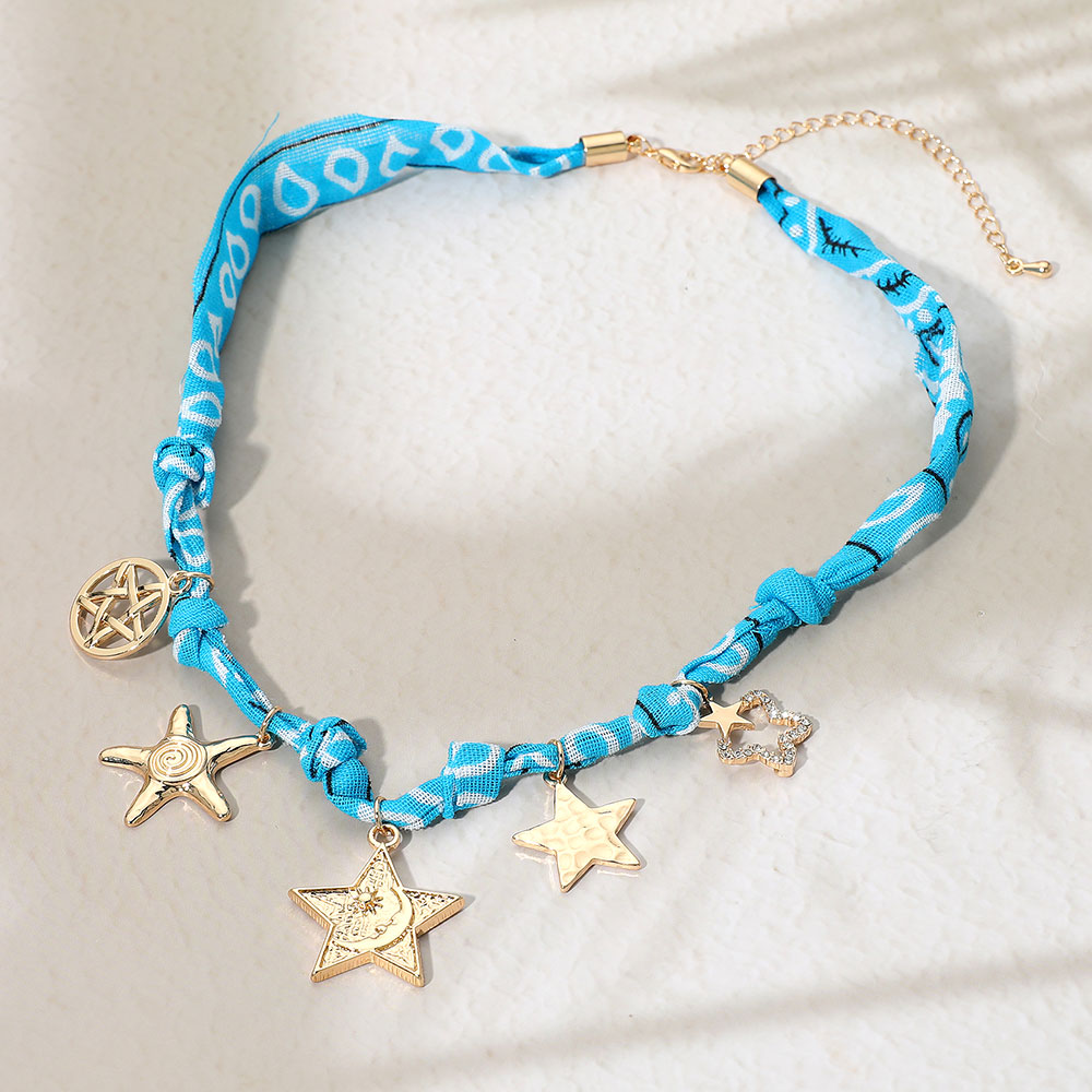 Details • Necklace Size : 16" + 3" L • Decor Size : 1.25" L • Stylish bandana necklace featuring an array of star-shaped charms and a pentagram pendant. Adjustable fit makes it perfect for layering or wearing alone, adding a bold and celestial-inspired touch to casual, festival, or statement looks. • Lead and Nickel Compliant