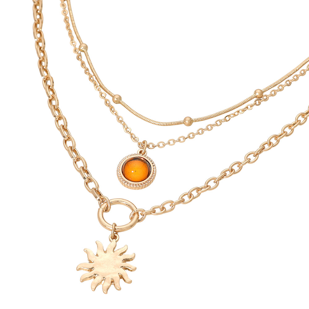 • Brighten your look with the Layered Sun Charm Necklace, featuring multiple delicately layered chains accented by a radiant sun charm and a round focal detail that adds dimension and style. Perfect for everyday outfits or pairing with other necklaces to create a personalized, trend-forward layered statement.