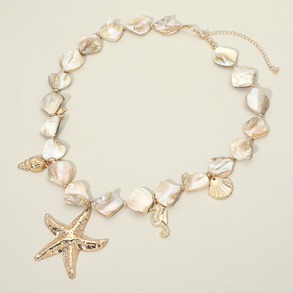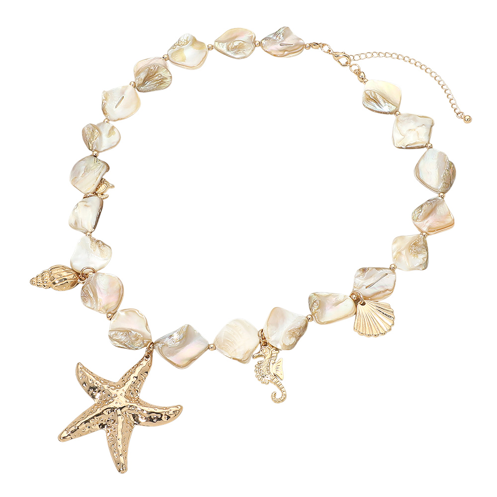 Details • Necklace Size : 19" + 3.25" L • Decor Size : 0.6" L • Pendant Size : 1.8" X 2" • Statement necklace designed with organic shell shaped beads and ocean inspired charms for a bold yet elegant look. The adjustable length allows versatile styling for resort wear, summer outfits, or special occasions, adding texture, movement, and a coastal inspired accent to any jewelry collection. • Lead and Nickel Compliant