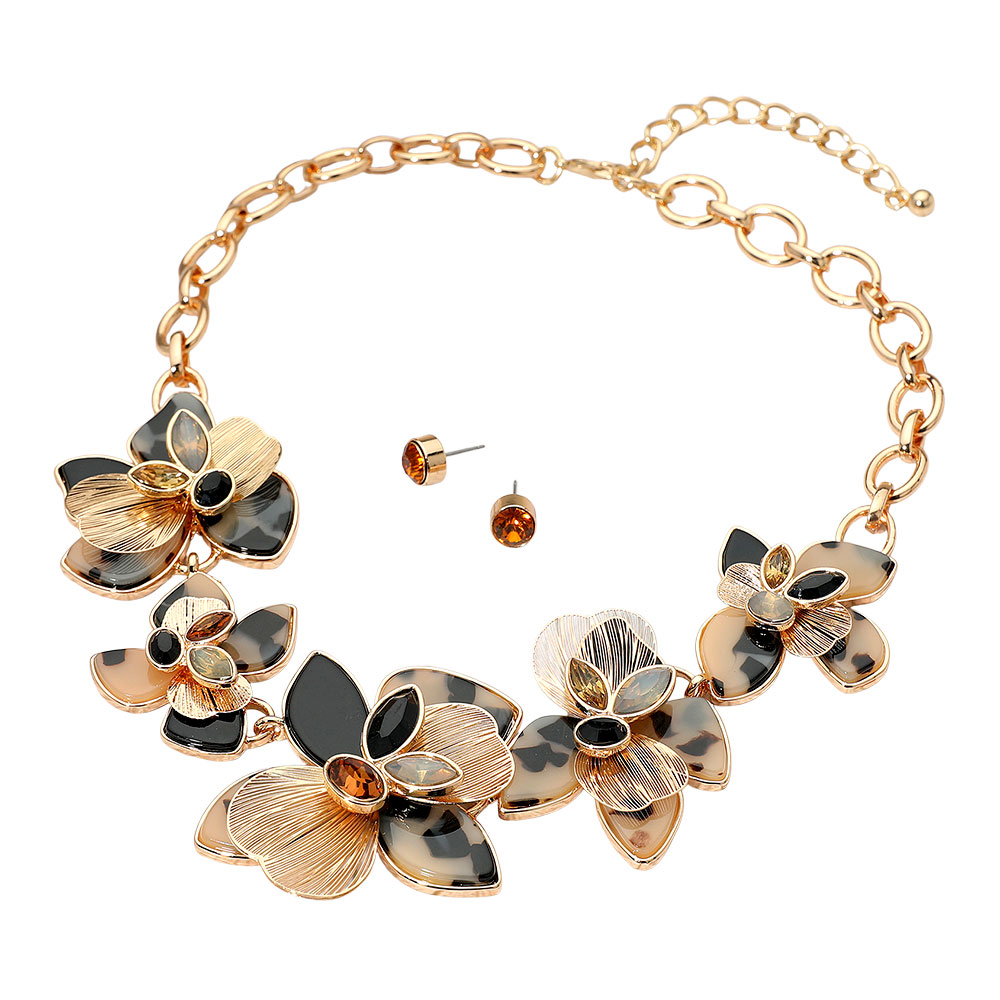 • Elegant floral statement necklace paired with matching stud earrings for a coordinated and eye-catching look. Designed with layered petal details, this accessory set adds a touch of sophistication and charm, making it ideal for special occasions or standout styling.