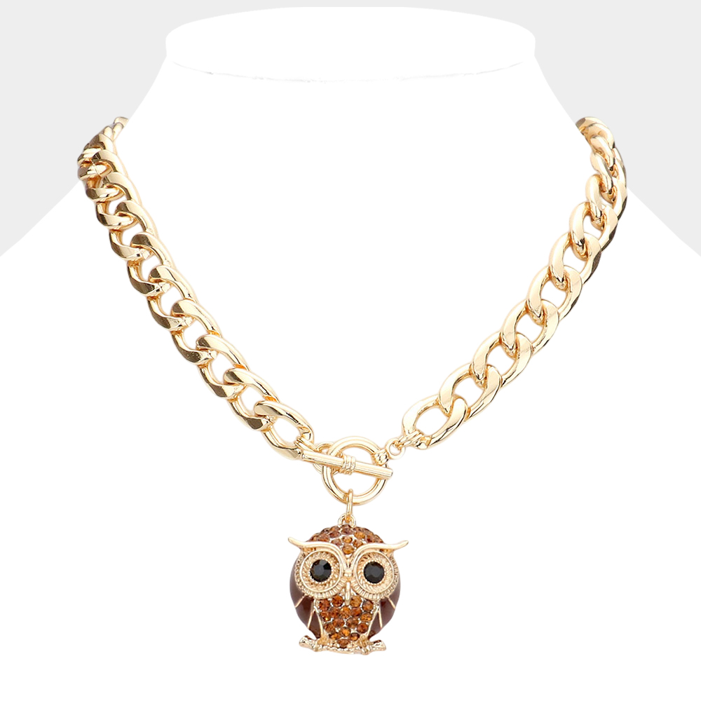 Stone Embellished Owl Pendant Toggle Necklace