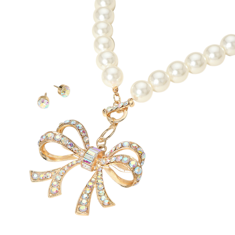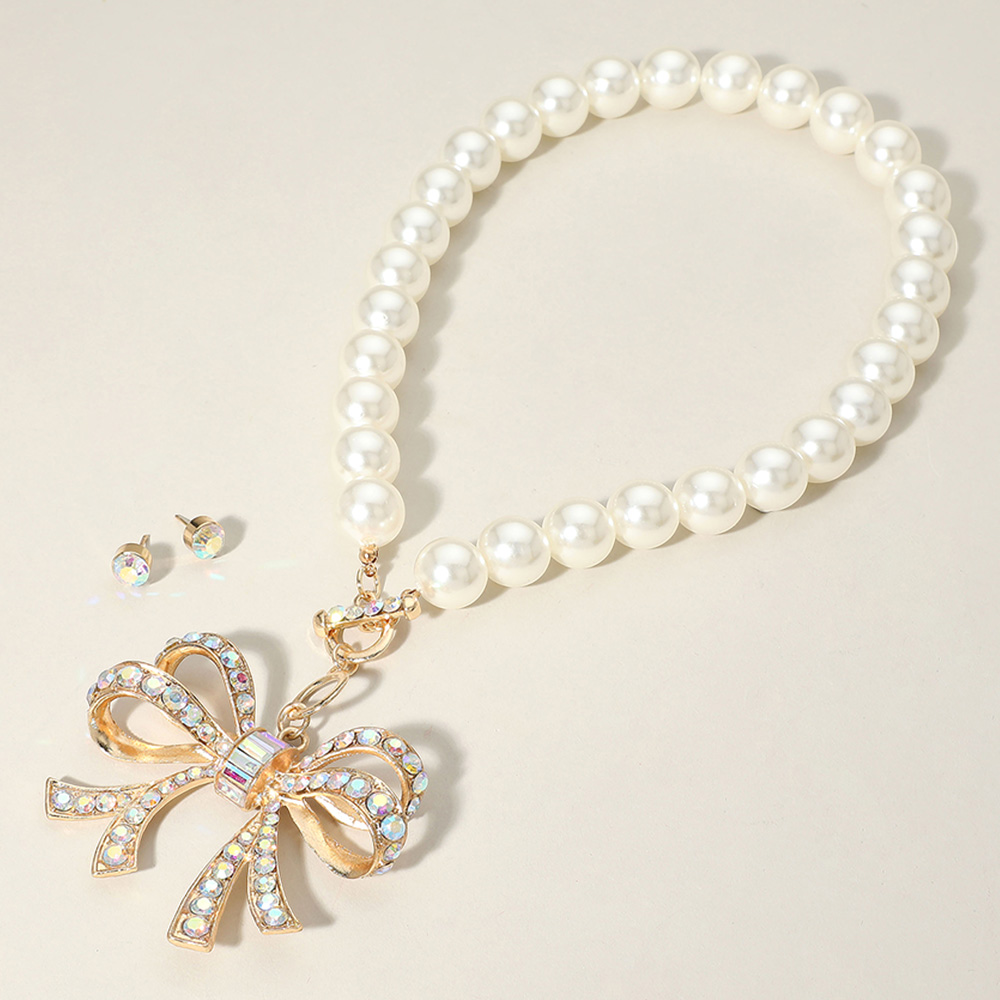 Stone Paved Bow Pendant Pearl Beaded Necklace