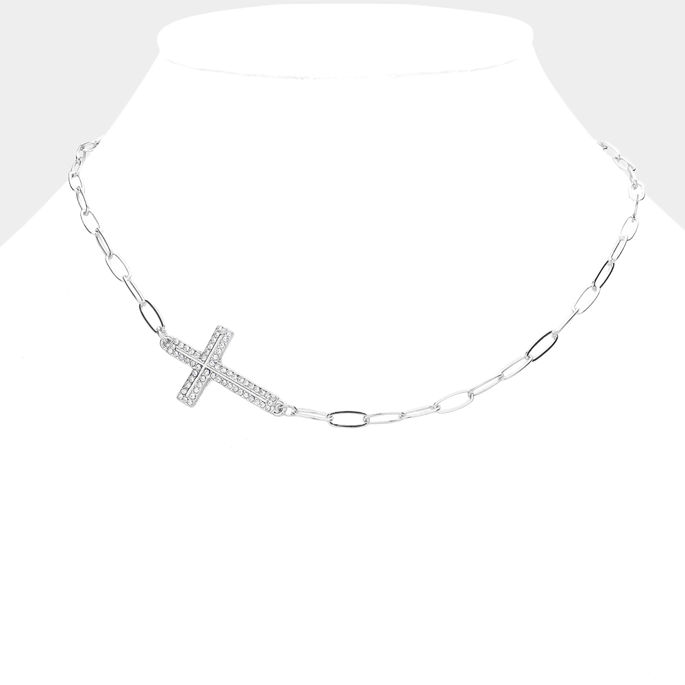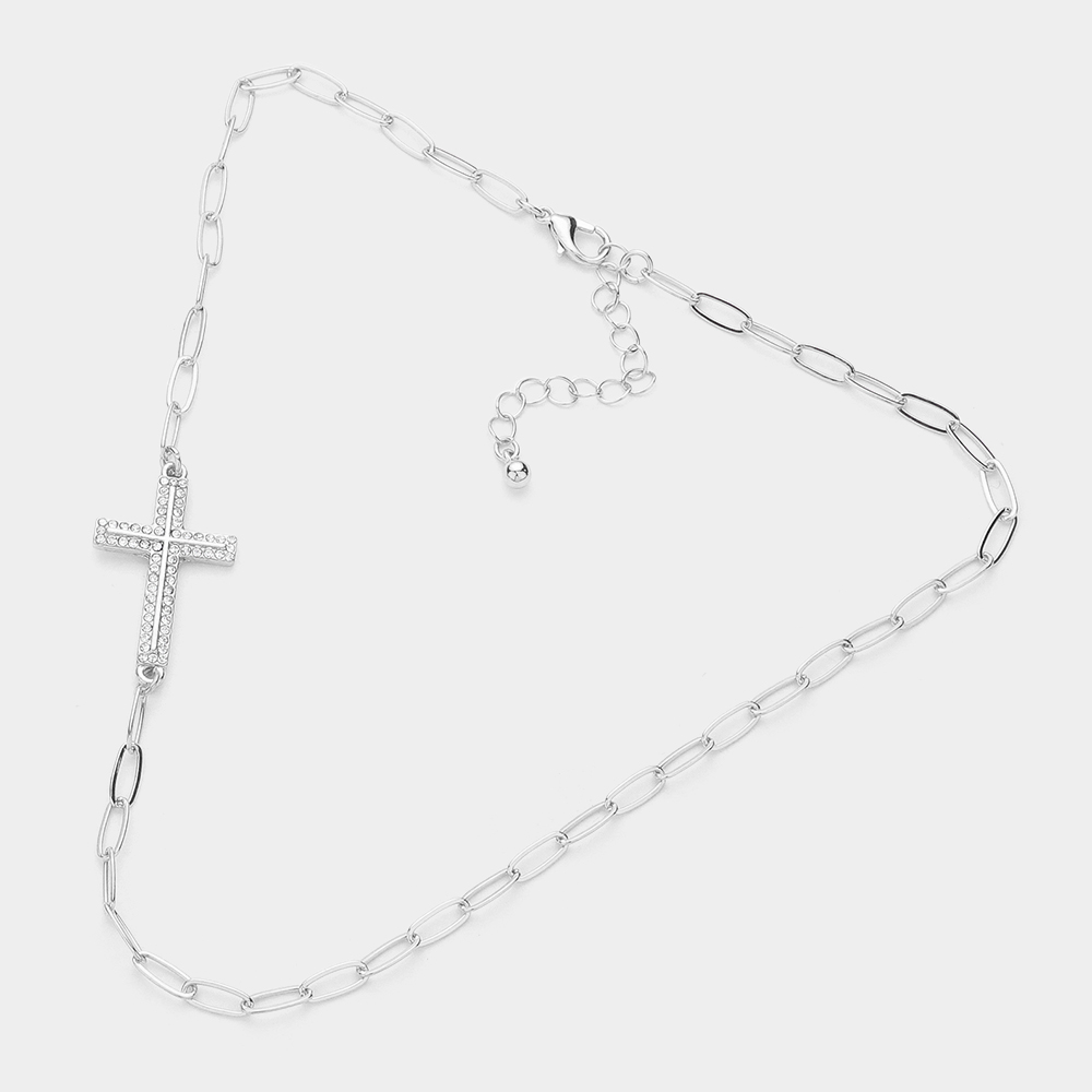 Stone Paved Cross Pendant Pointed Paperclip Chain Necklace