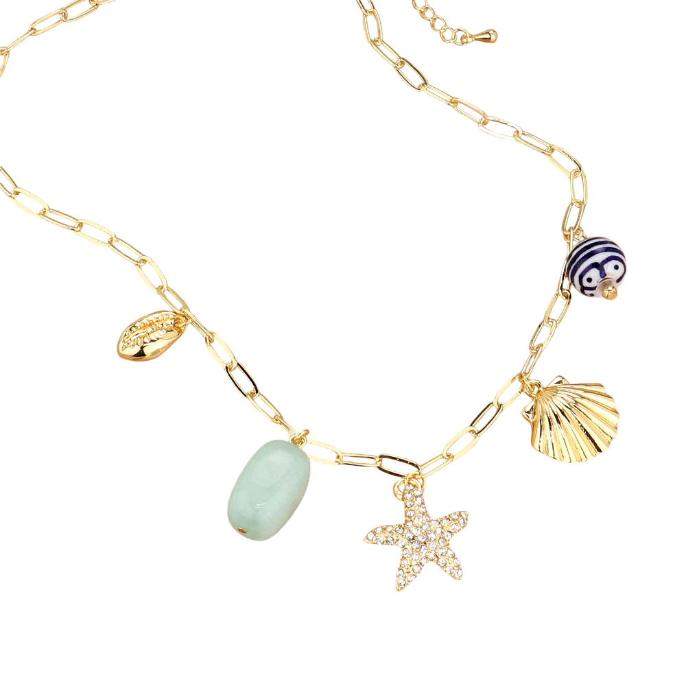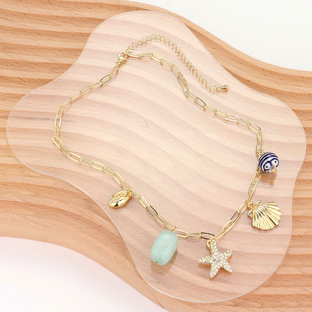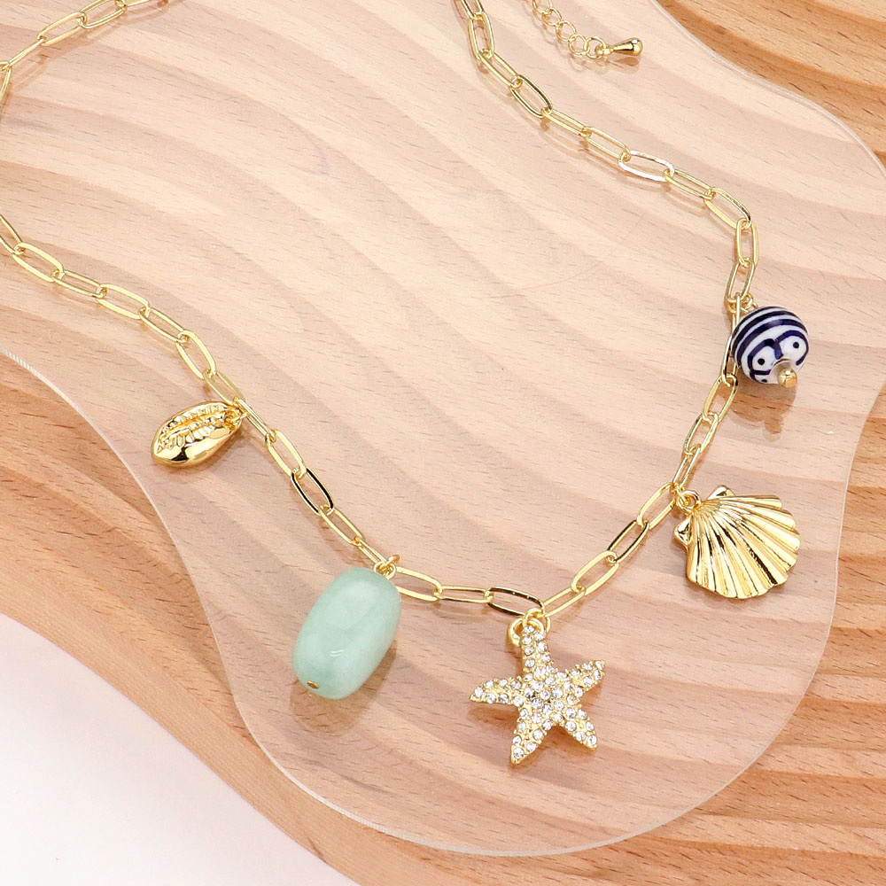 Stone Paved Starfish Puka Shell Shell Natural Stone Charm Station Paperclip Chain Necklace