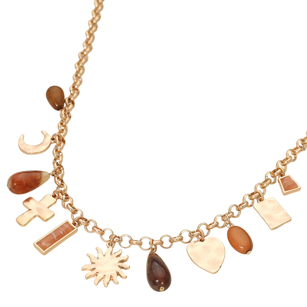• Add personality to any outfit with this charm cluster statement necklace, featuring assorted symbolic charms arranged along a bold chain for an eye-catching layered look. Designed to elevate casual wear or complement dressier styles with playful, modern flair.