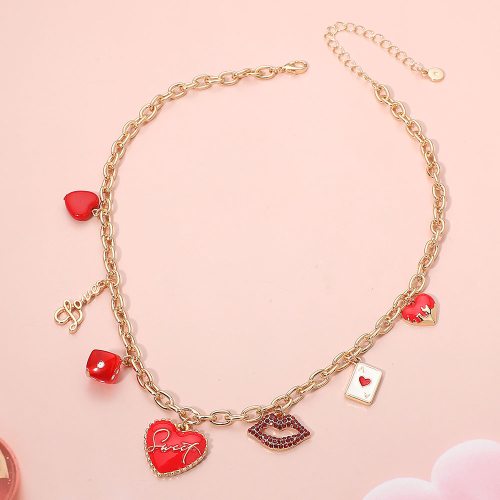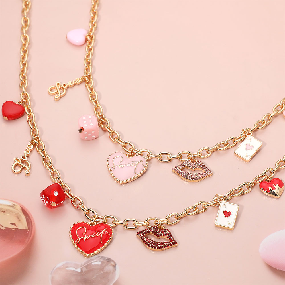 Details • Necklace Size : 16" + 3.5" L • Decor Size : 1.2" L • This sweetheart charm necklace brings fun and flair with its playful mix of heart, lips, dice, and card motifs. Designed on a delicate chain with bold enamel details, it adds a flirty, expressive touch to any outfit—perfect for gifting or making a personal fashion statement. • Lead and Nickel Compliant